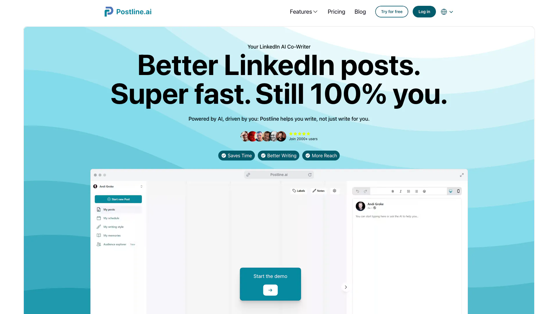 Postline is an advanced AI-powered[1] tool designed to help users create engaging LinkedIn posts[2] effortlessly. By leveraging real-time information and personalized writing[4] styles, Postline enables users to craft posts that resonate with their audience, enhance engagement, and foster growth on LinkedIn. This innovative tool acts as a co-writer, assisting in generating content while allowing users to maintain their unique voice and style. With Postline, users can save time, improve their writing quality, and increase their reach on LinkedIn.