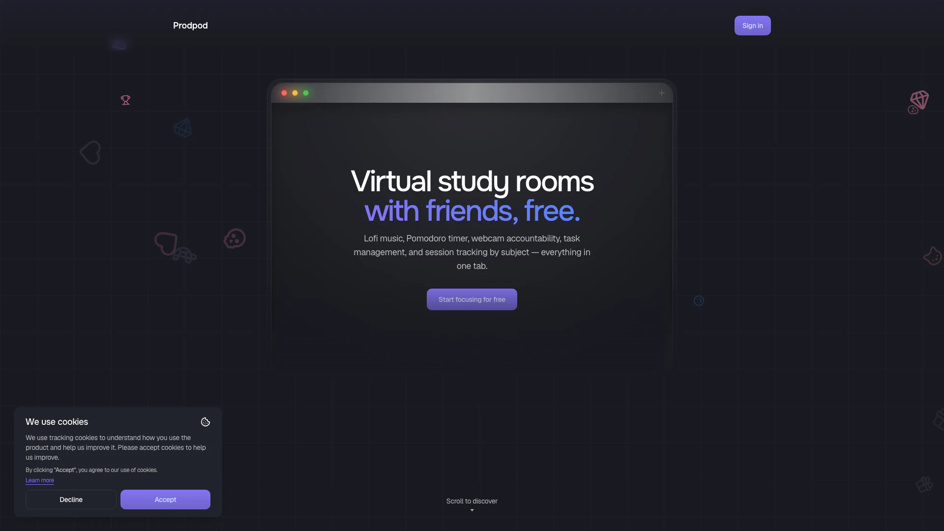 Prodpod is a platform that offers free aesthetic virtual study rooms for students, featuring tools like a Pomodoro timer, lofi music, webcam accountability, and session tracking by subject.