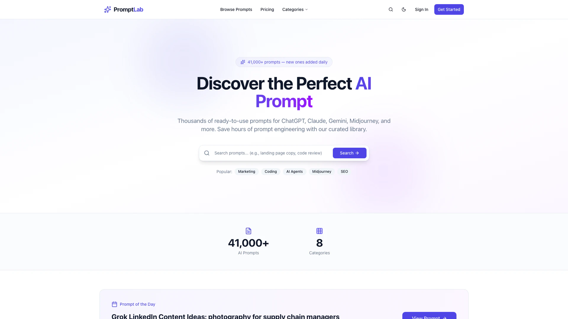 - Extensive Prompt Library: PromptLab offers over 41,000 expert-crafted AI prompts, covering various categories such as marketing, coding, and content creation, making it a comprehensive resource for users.