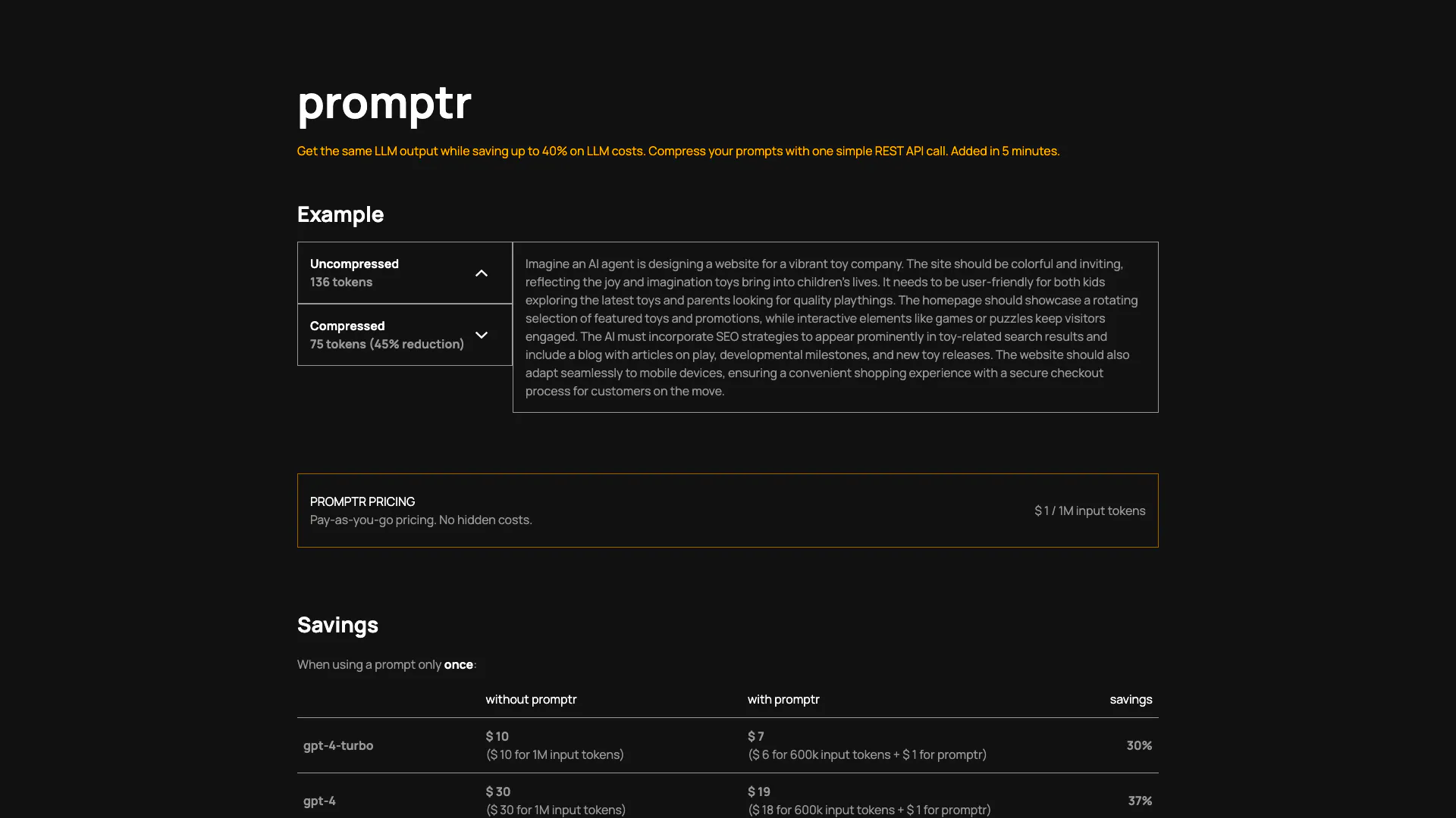 - Cost Savings: Promptr allows users to save up to 40% on LLM costs by compressing prompts, making it a cost-effective solution.