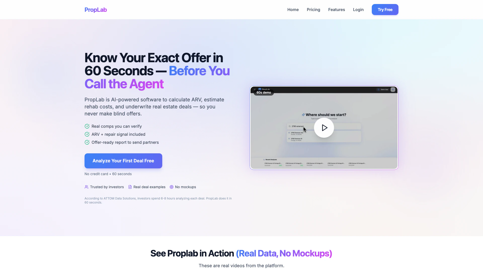 - Fast Deal Analysis: PropLab allows real estate investors to analyze deals in just 60 seconds, significantly reducing the time spent on deal evaluation.