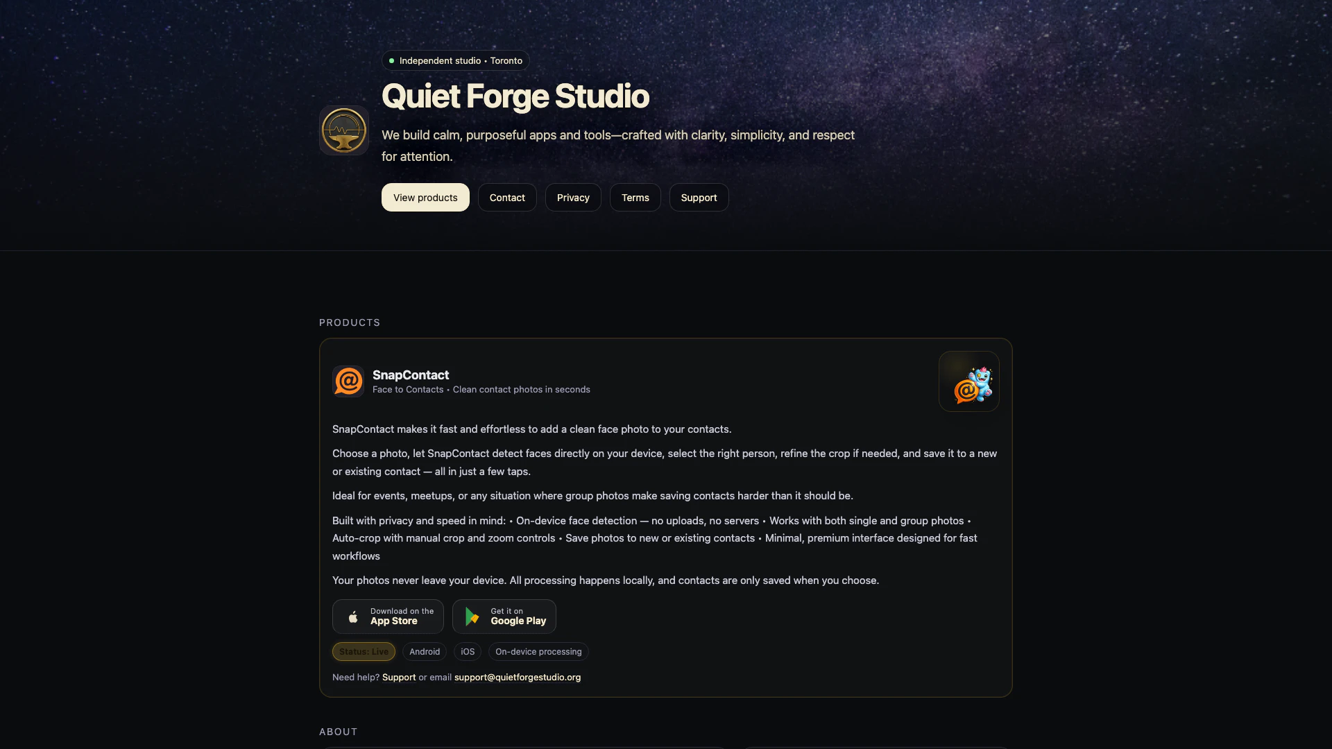 You can get support for the SnapContact app by contacting us at support@quietforgestudio.org. We aim to respond within 48 hours.