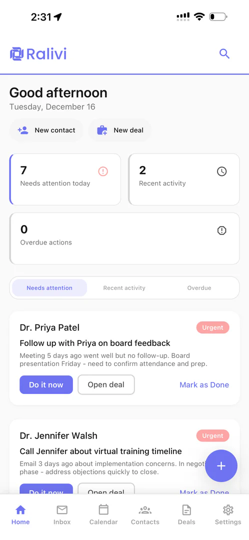- Receive your action list: Each morning, Ralivi generates a prioritized action list detailing who requires your attention and what tasks need to be completed, enabling you to manage your day effectively.