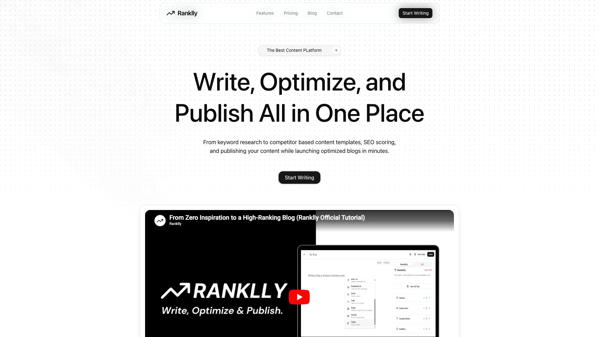 Ranklly is the all-in-one content platform that allows users to write SEO-optimized blogs, build websites, and publish content in minutes using AI-powered tools.
