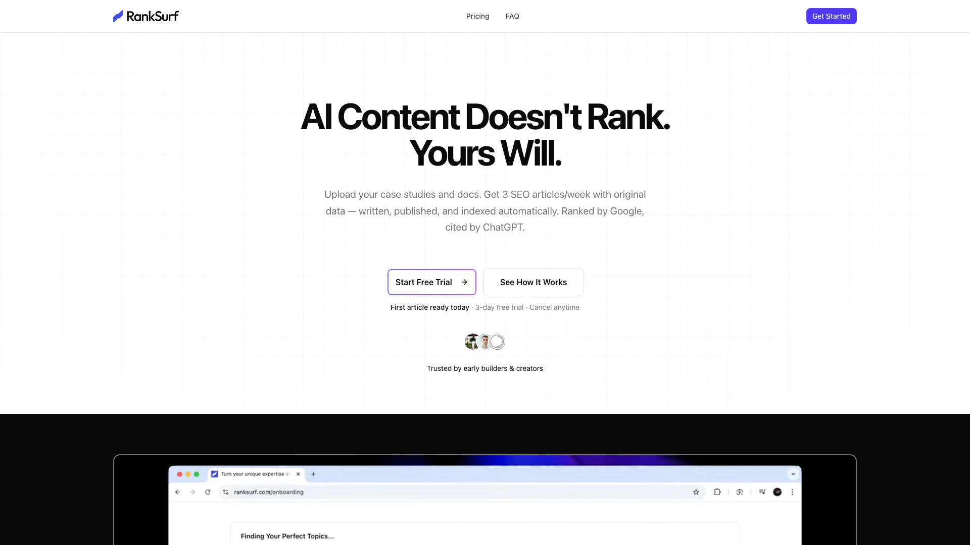 - SEO-Optimized Content Creation: RankSurf generates SEO-optimized articles from your unique data, ensuring high rankings in both Google and AI search engines.