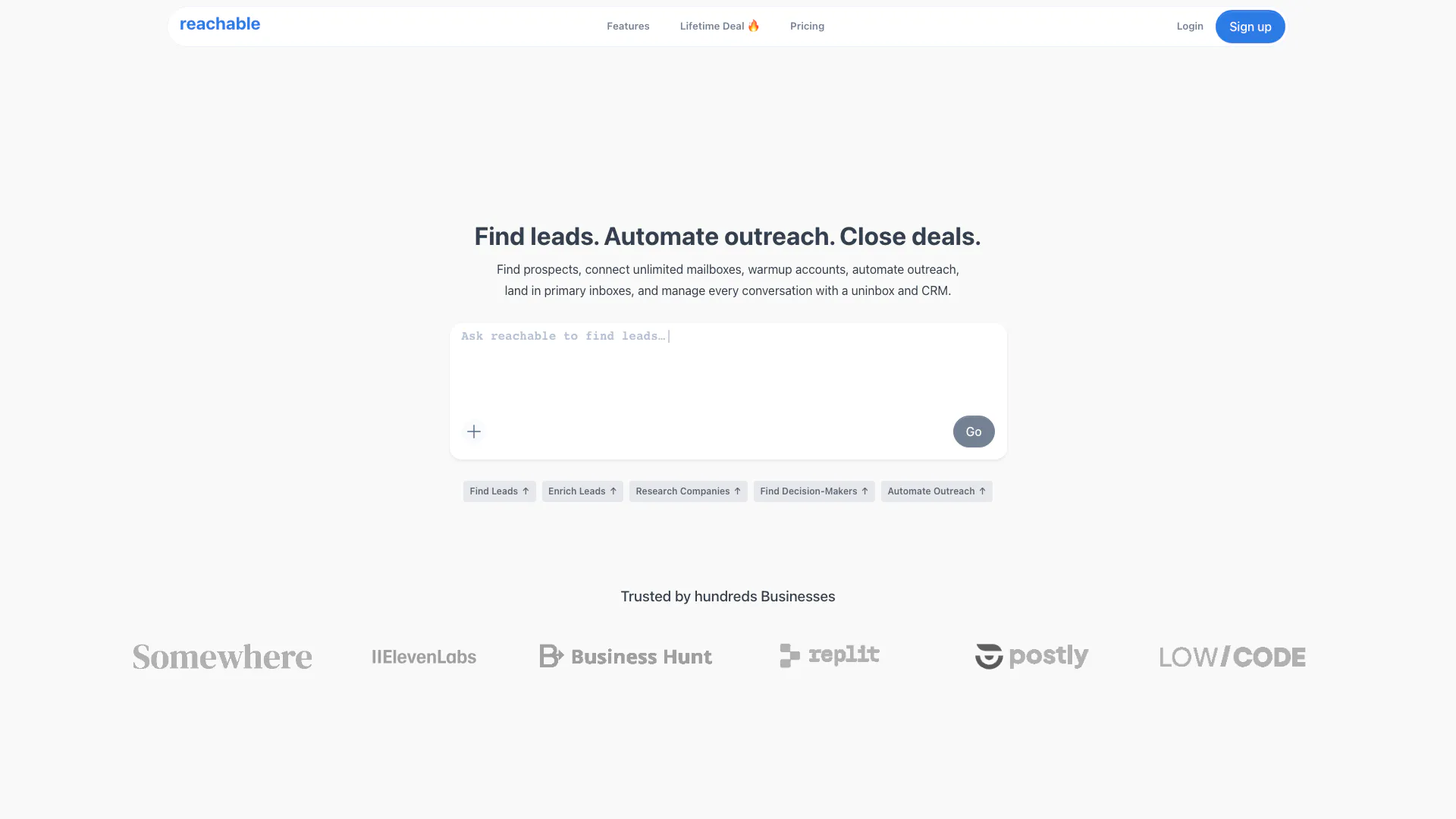 Reachable is a powerful lead generation and outreach automation tool designed to help businesses find leads, automate their outreach efforts, and ultimately close more deals. It provides a comprehensive platform where users can find prospects, enrich leads, and manage conversations through an integrated CRM system. With its advanced features, Reachable allows users to connect multiple email accounts, personalize outreach at scale, and segment campaigns effectively, making it an essential tool for any sales or marketing team looking to enhance their lead generation efforts.