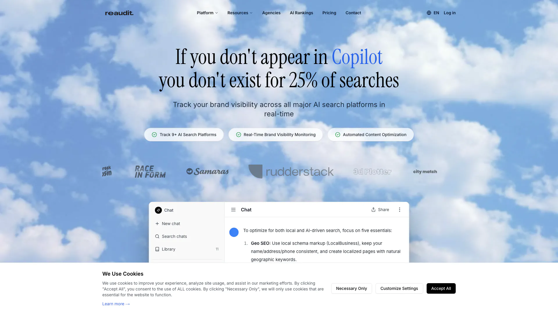 Reaudit is a cutting-edge platform designed to track your brand's visibility across all major AI search engines in real-time. This innovative tool allows businesses to monitor their presence on platforms like ChatGPT, Claude, Perplexity, and Gemini, ensuring they are discoverable in an increasingly AI-driven digital landscape. By optimizing for AI discoverability, Reaudit helps brands adapt to the evolving nature of search, where traditional SEO strategies may fall short. The core value of Reaudit lies in its ability to provide automated content optimization and real-time insights, enabling brands to enhance their online presence and compete effectively in the AI search arena.
