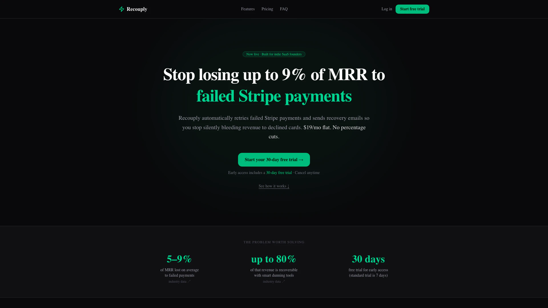 Recouply automatically retries failed Stripe payments and sends recovery emails on autopilot. This plan includes a 30-day free trial, no credit card required, and a flat fee of $19/month with no percentage cuts.