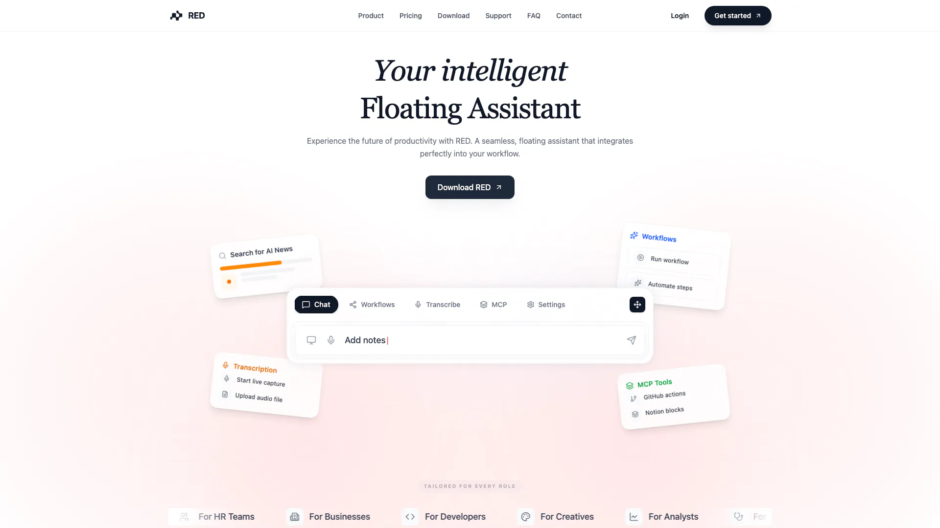 Perfect for trying RED. Limited access to Red chats, Basic access to screen capture, 2 Agentic workflows, 10 mins transcription/month.