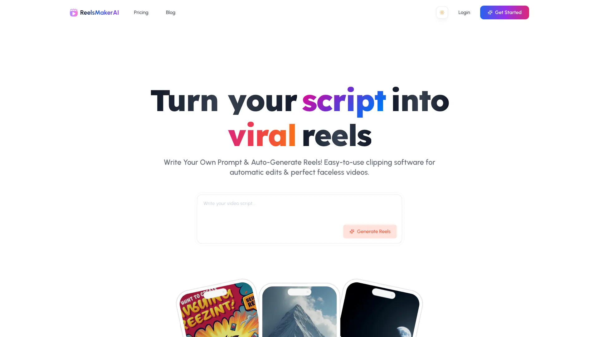 - AI Creates Content: Watch as Reelsmakerai's advanced AI generates compelling scripts, stunning visuals, and professional narration based on your prompt.