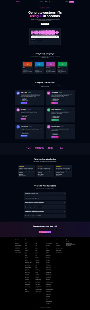 Riffgen is an innovative AI-powered[1] music generation[2] tool that allows users to create custom riffs[3] in seconds. Leveraging the latest advancements in artificial intelligence, Riffgen caters to musicians and creators by enabling them to generate unique musical compositions across various genres. From rock to jazz and electronic to classical, Riffgen offers a comprehensive suite of tools designed to enhance the creative process, making music generation accessible and efficient for everyone.