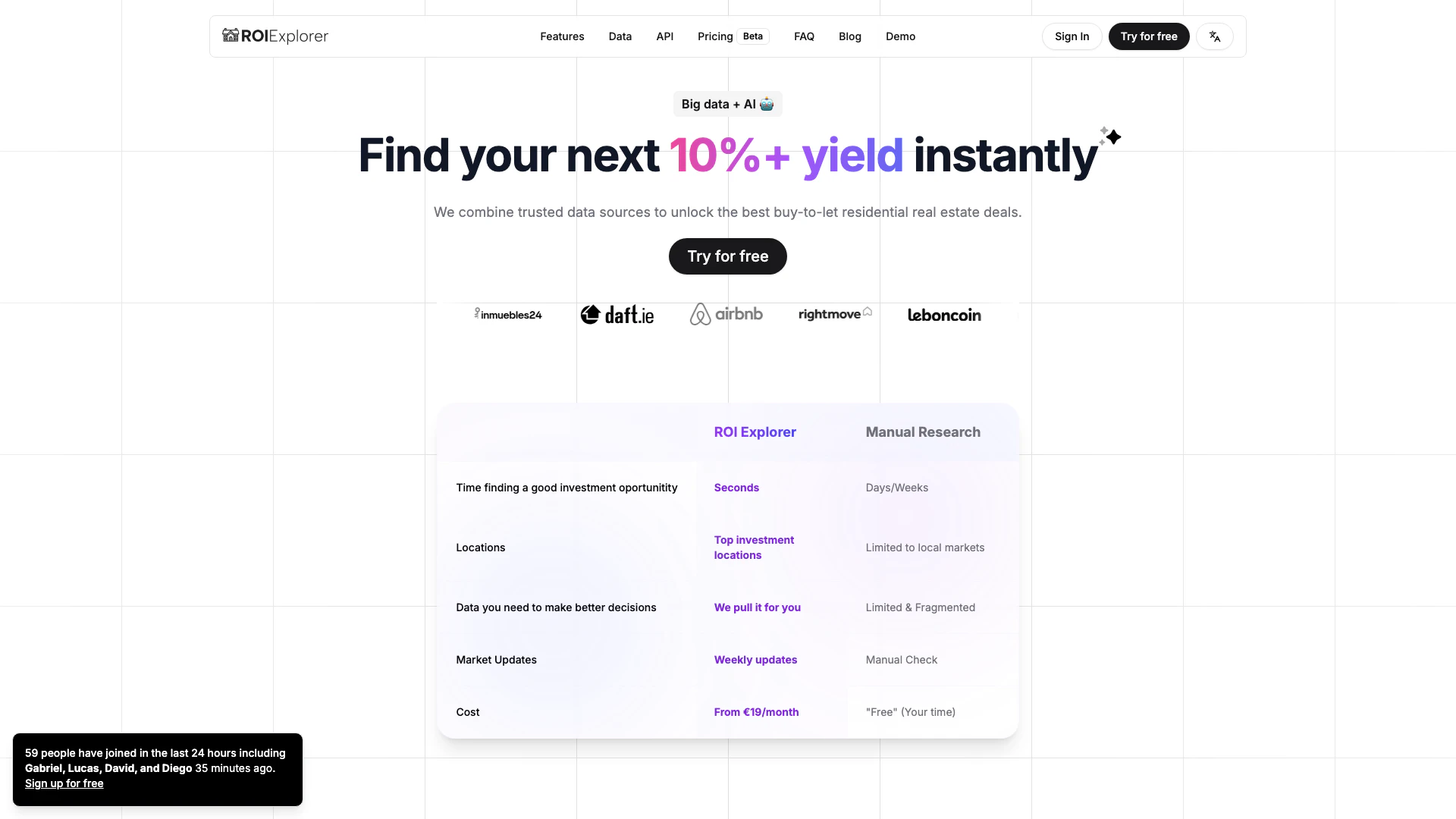 ROI Explorer is a cutting-edge SaaS platform[3] designed to revolutionize real estate[1] investment analytics[2]. It empowers investors by providing advanced tools to make data-driven decisions, enabling them to maximize returns in a rapidly changing market. The platform combines trusted data sources and AI technology to help users quickly identify lucrative buy-to-let residential real estate deals, reducing the time and effort traditionally required for manual research. With ROI Explorer, investors can access comprehensive market insights, analyze properties efficiently, and stay updated on market trends, all from one user-friendly interface.