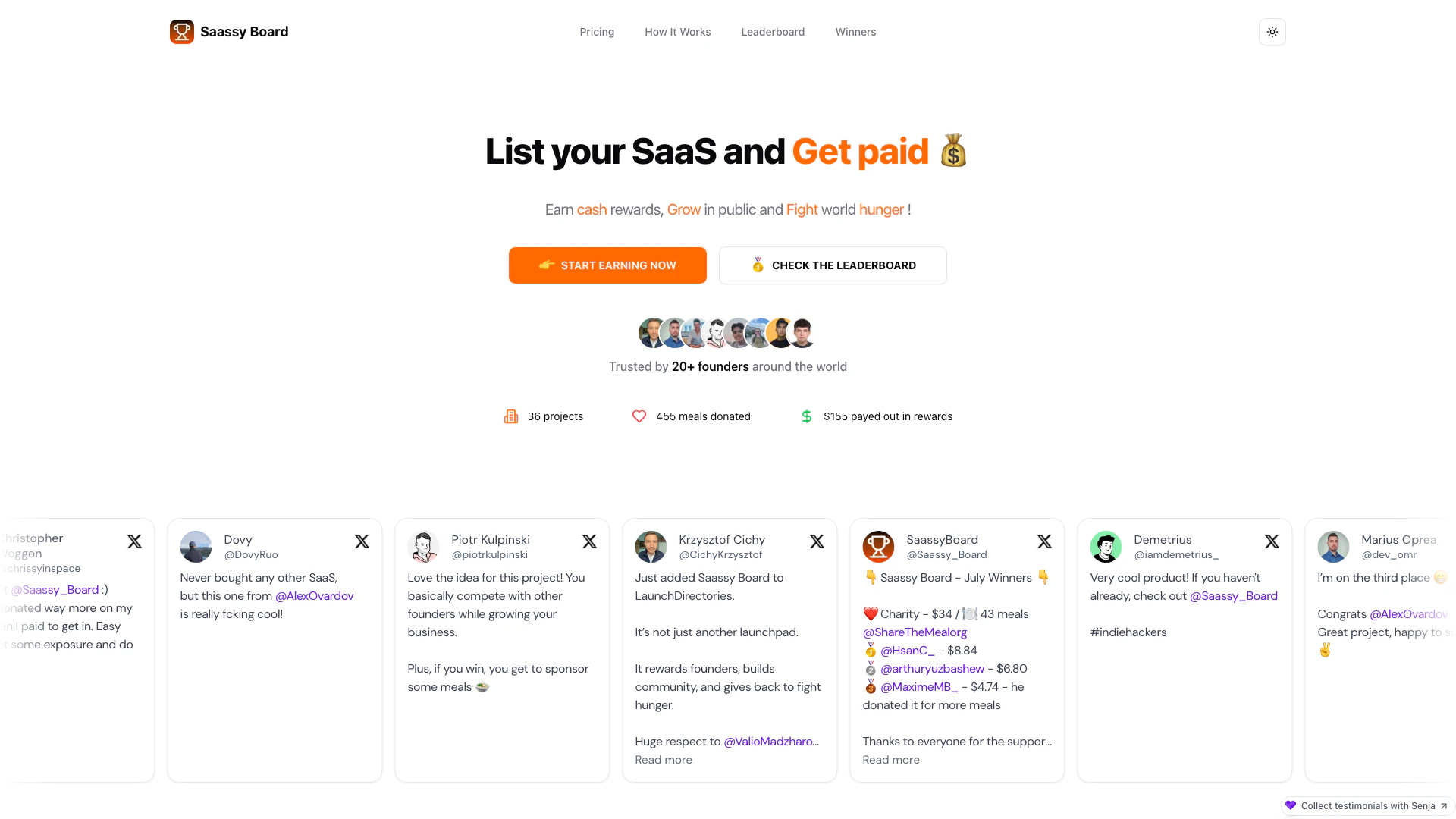 Saassy-board is an innovative platform designed for SaaS (Software as a Service) creators to list their products, earn monthly cash[2] rewards, and contribute to the fight against world hunger. By connecting their SaaS offerings to Saassy-board, users can not only gain visibility in the market but also engage in a community-driven initiative that donates 50% of the platform's revenue to charity. This unique approach allows SaaS founders to grow their businesses while making a positive impact on society.