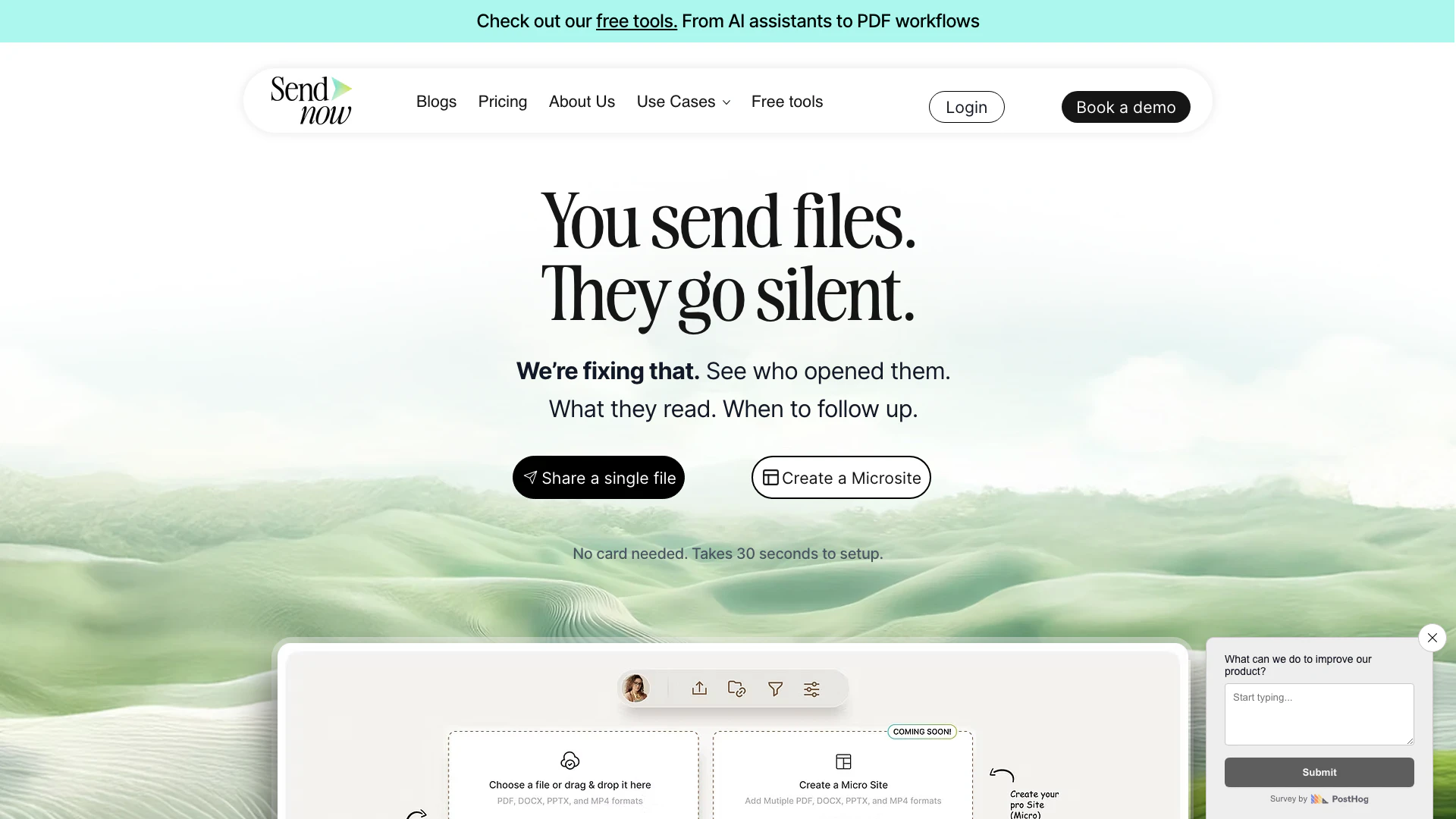 Sendnow is an innovative tool designed to create trackable microsites[1] for bundling sales proposals[2], pitch decks[3], and files. It allows users to see who viewed each page and when, enabling effective follow-ups. As a cost-effective alternative to DocSend, Sendnow offers a free forever plan, allowing users to manage their sales materials efficiently. With a focus on user engagement, Sendnow provides analytics to track interactions, ensuring users can follow up with prospects effectively.