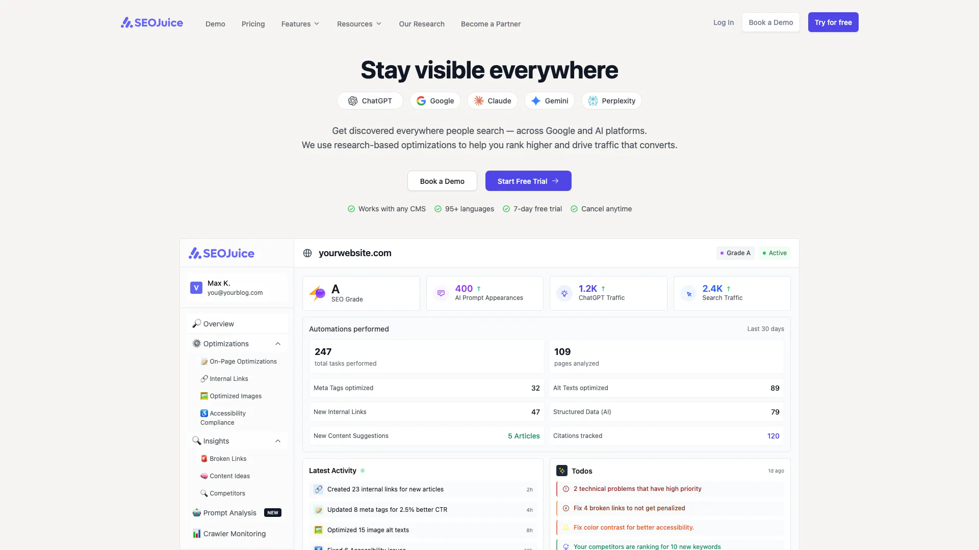 SEOJuice is an innovative SEO automation[1] tool designed to enhance your online visibility across major search engines, including Google and AI platforms like ChatGPT and Claude. By utilizing data-driven on-page optimizations[2], SEOJuice helps businesses track and optimize their website performance, driving traffic that converts. This tool is particularly beneficial for those looking to improve their search rankings and overall site hygiene without the need for extensive manual effort.