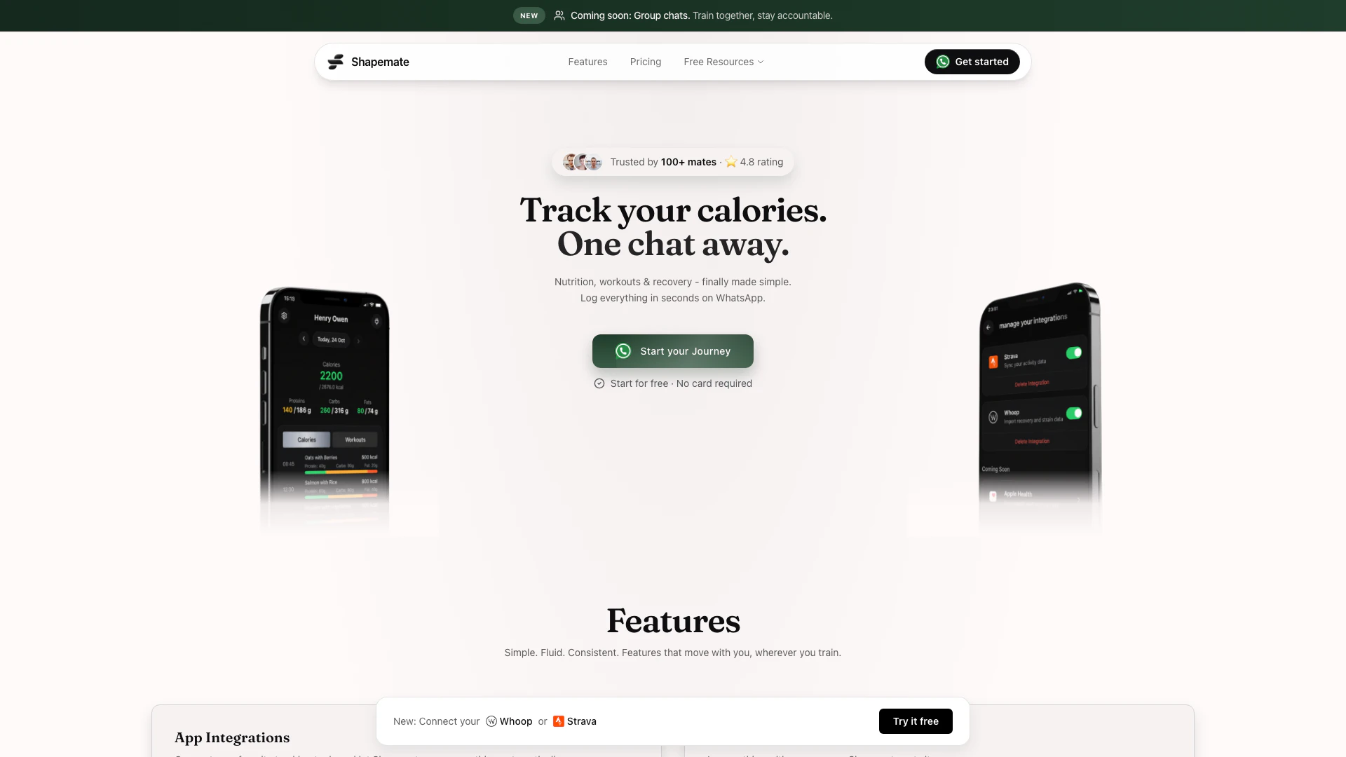 Shapemate is an innovative fitness tracking tool that operates directly through WhatsApp, allowing users to easily log their workouts, meals, and recovery. It offers smart insights, integrates with popular fitness platforms like Strava and Whoop, and provides a personal dashboard to visualize health metrics. With Shapemate, managing your fitness journey becomes seamless and accessible, as it combines convenience with comprehensive tracking capabilities.