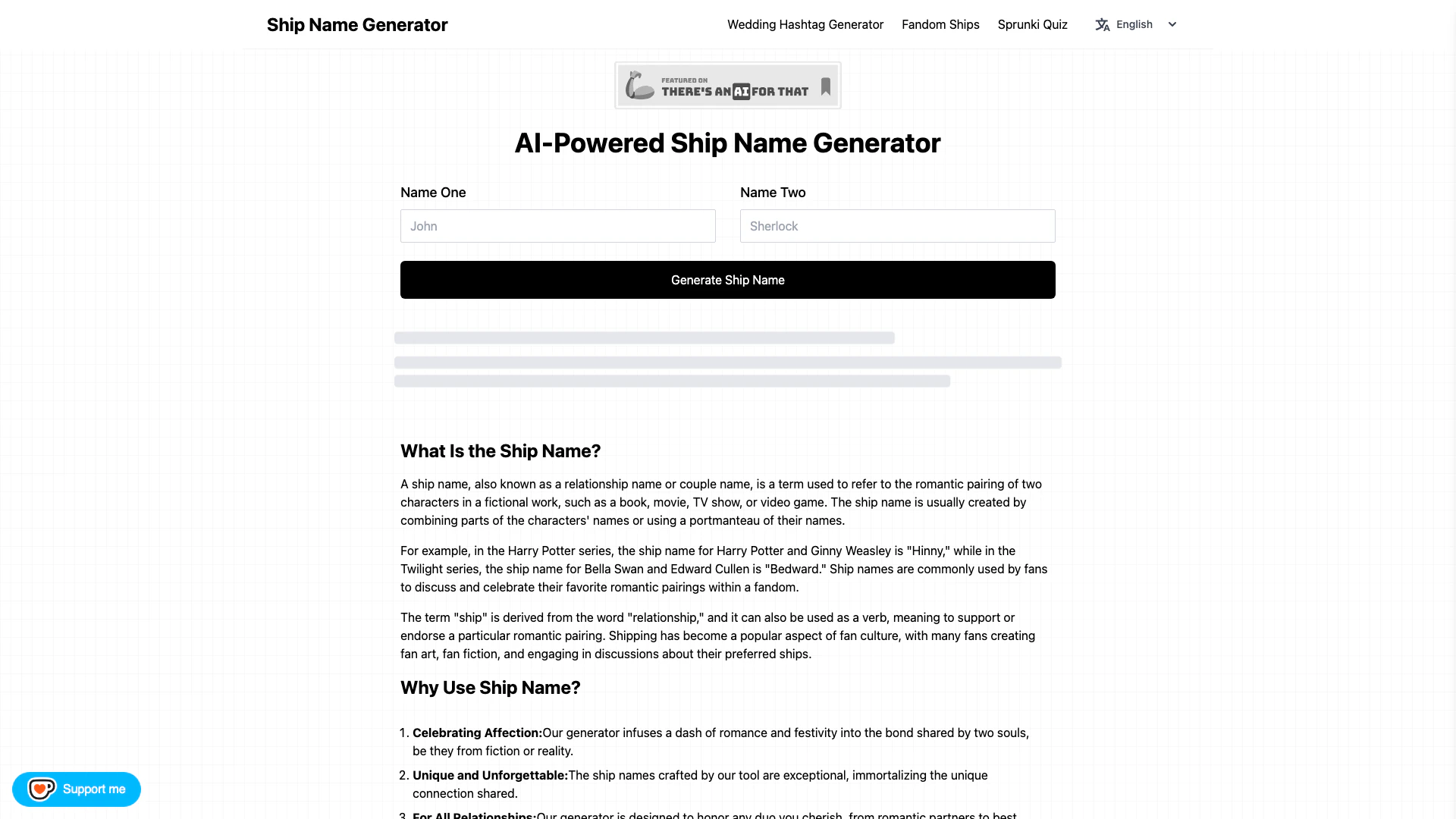 The Ship Name Generator is an innovative online tool designed to create unique and creative ship names for couples, friends, or fictional characters. By combining parts of two names or words, it generates memorable ship names that celebrate relationships. This tool is especially popular in fan culture, where fans create ship names for their favorite couples in books, movies, and TV shows. Whether you're looking for a fun name for a romantic duo or a nickname for best friends, the Ship Name Generator offers a playful and engaging way to honor those special bonds.