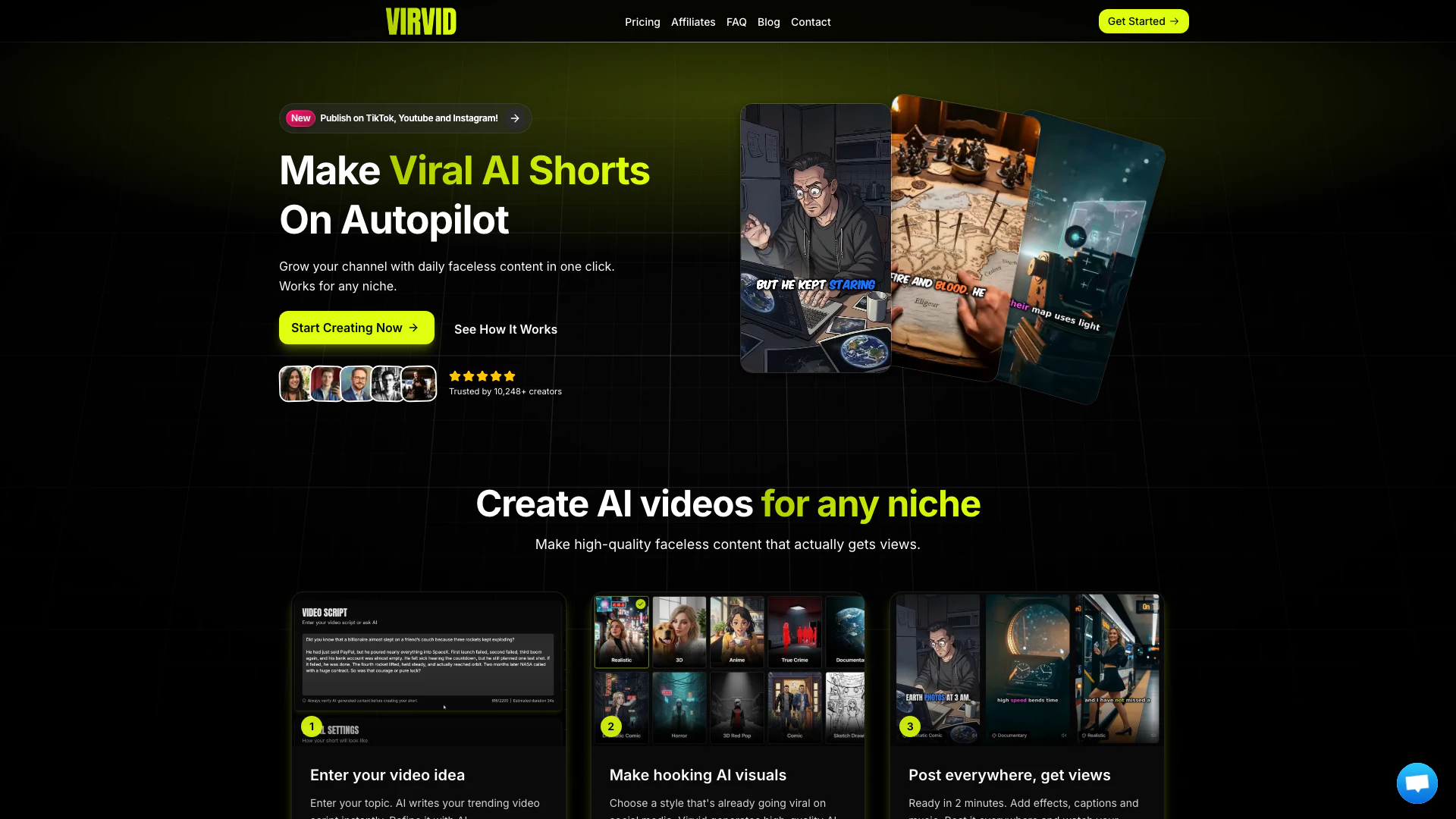 Virvid is the best AI shorts generator for content creators, entrepreneurs and digital marketers. Whether you're building an audience or promoting your brand, Virvid helps you make viral TikToks, Instagram Reels, and YouTube Shorts on autopilot. Post engaging faceless videos and grow your channel fast. No camera, no editing skills, no complicated AI workflows. Just trending content ready to post, made for you daily.