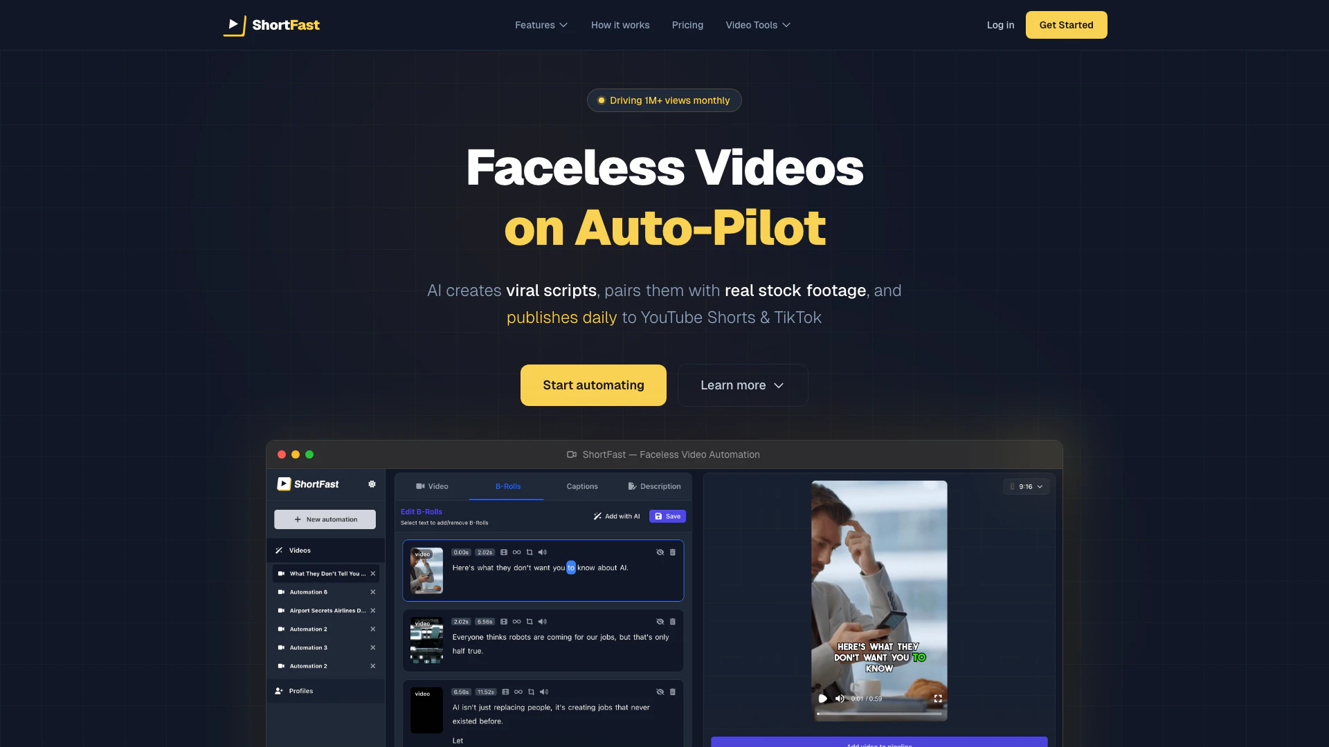 - AI-Powered Video Generation: Shortfast utilizes AI to create faceless videos, generating scripts, voiceovers, and pairing them with real stock footage, ensuring professional quality.