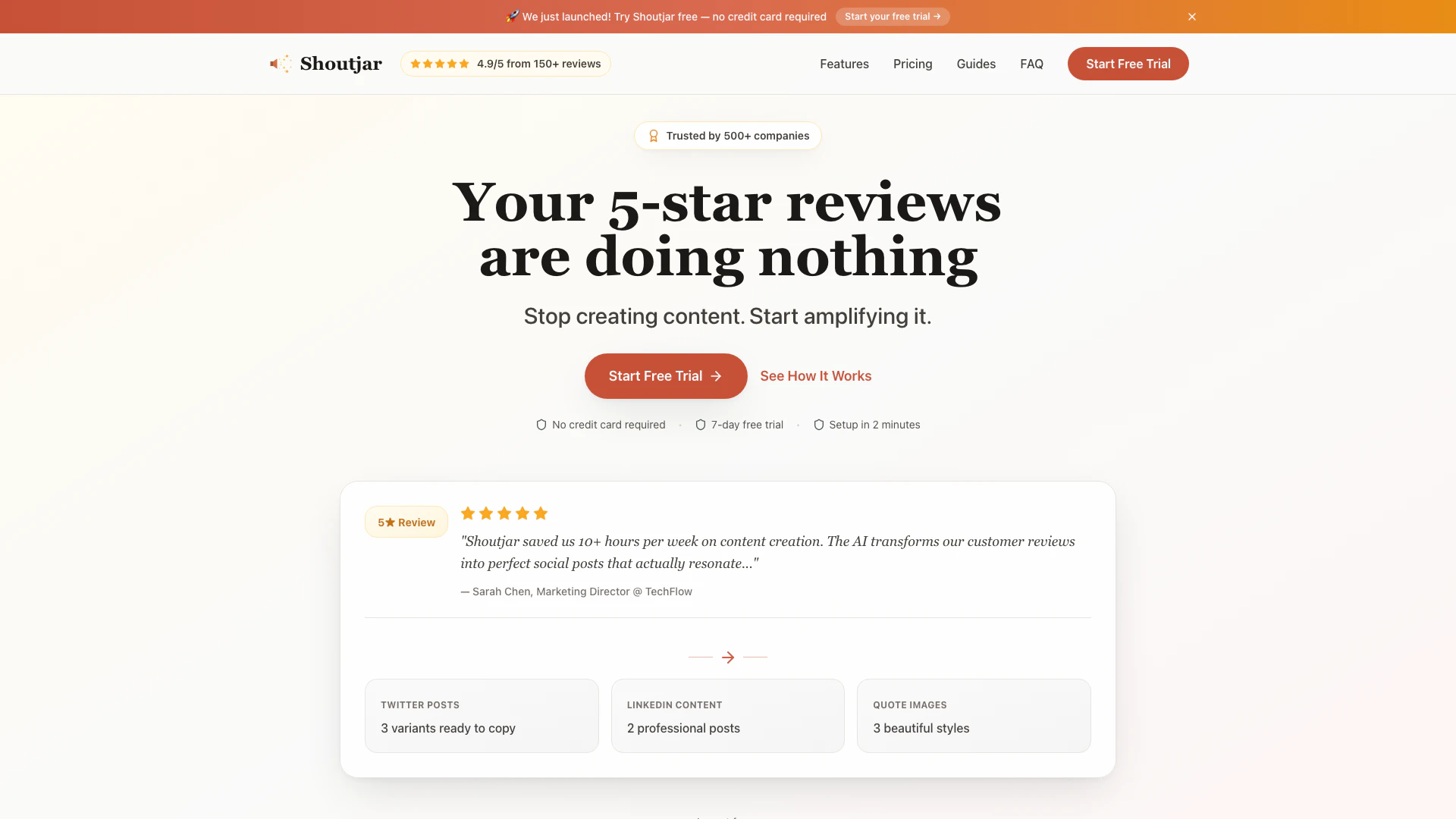 Shoutjar saved us 10+ hours per week on content creation. The AI transforms our customer reviews into perfect social posts that actually resonate... — Sarah Chen, Marketing Director @ TechFlow