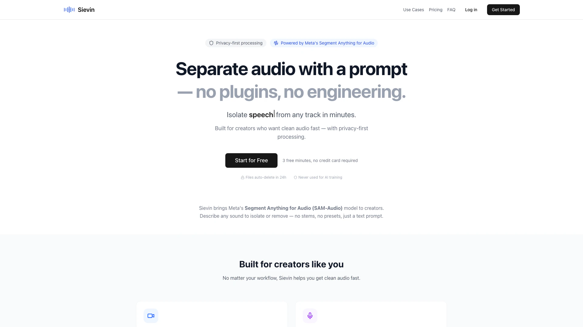Sievin offers several key features that enhance audio processing: - Prompt-Based Audio Separation: Isolate or remove sounds based on descriptive text prompts, allowing for flexibility in audio editing. - Privacy-First Processing: Ensures audio files are processed securely on isolated GPU instances, with automatic deletion after 24 hours. - User-Friendly Interface: No engineering skills are required; the tool is designed for creators of all levels. - Support for Multiple Formats: Compatible with various audio formats including MP3, WAV, FLAC, and M4A. - Fast Processing: Get results in minutes, streamlining the audio editing workflow.