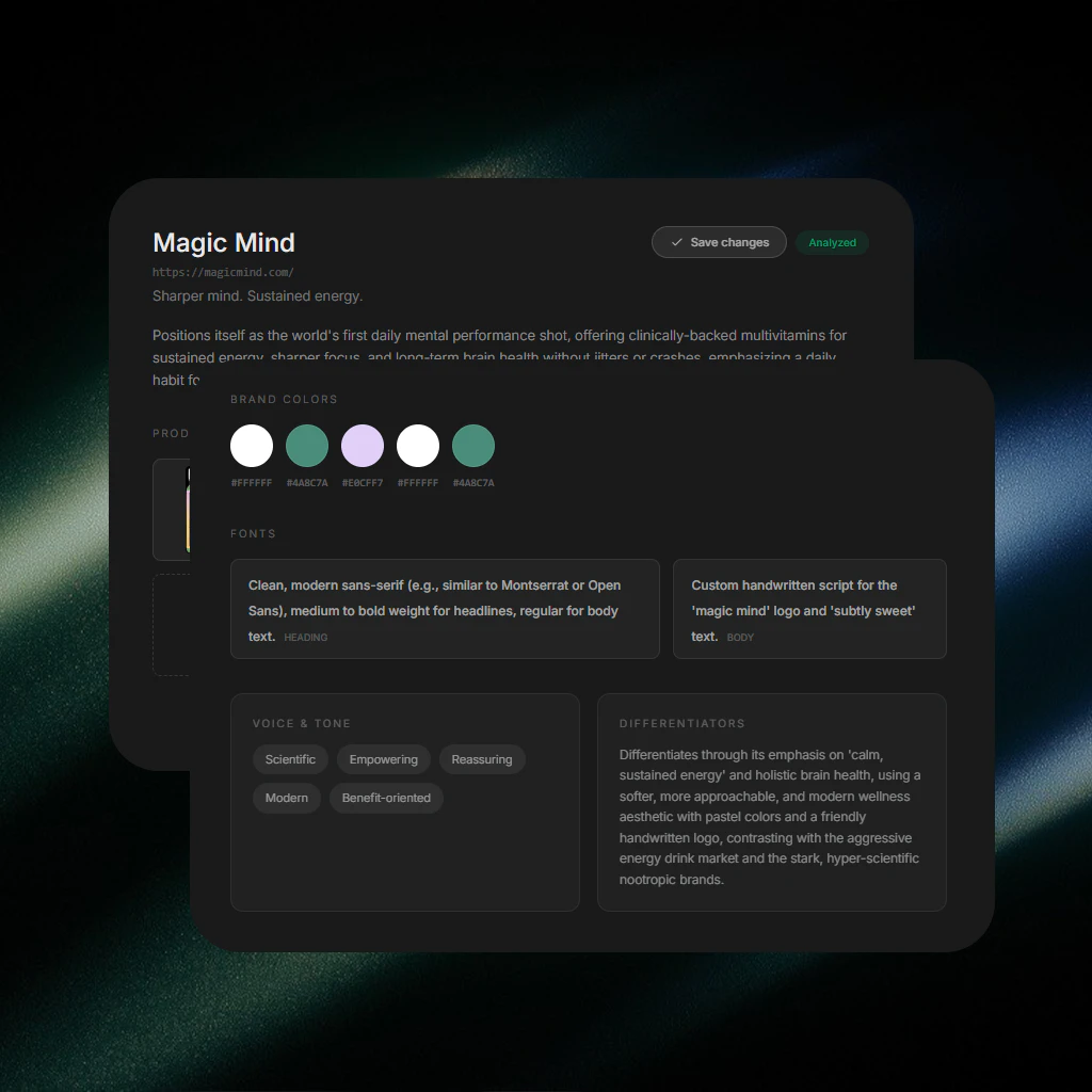- Instant Brand DNA Extraction: Quickly analyzes any brand URL to extract essential elements like colors, fonts, and visual identity, ensuring all generated ads are on-brand.