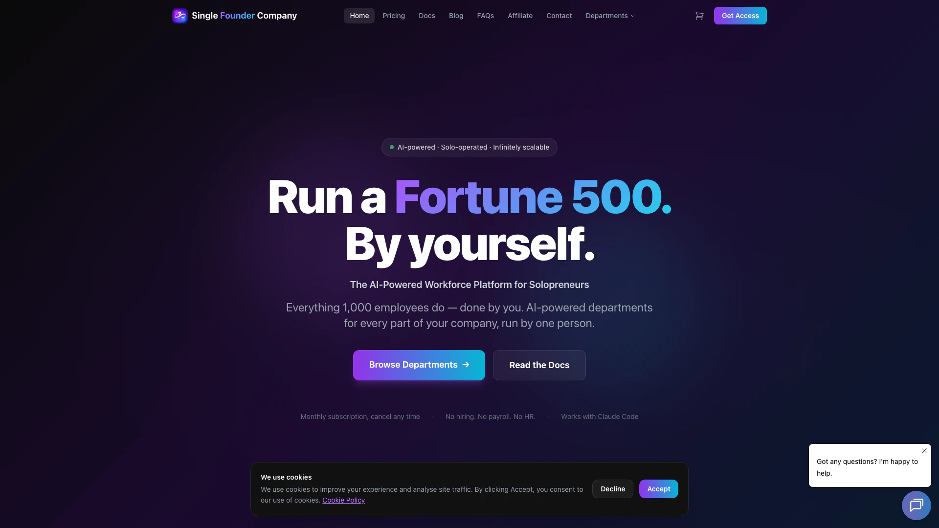 Singlefoundercompany is an innovative AI-powered[1] workforce platform[2] designed specifically for solopreneurs[3]. It enables a single founder to run a business as efficiently as a Fortune 500 company by automating various departments typically managed by a large team. The platform offers configurations for 11 departments, each equipped with specialized AI agents that handle tasks across engineering, marketing, design, and more, allowing entrepreneurs to scale their operations without the need for traditional hiring, payroll, or HR.