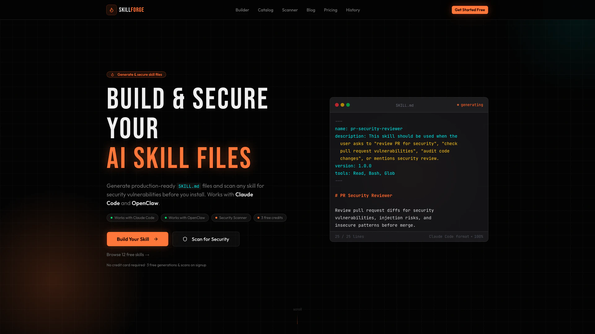Try it out. No credit card required. 3 AI skill generations, Claude Code + OpenClaw formats, ZIP download with install guide, Access to free catalog skills.