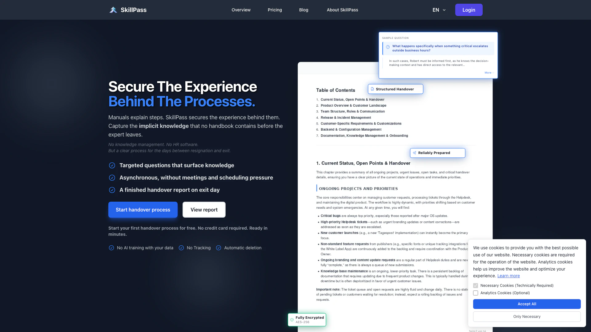 Skillpasspro is an innovative knowledge transfer[1] tool designed to capture and secure the implicit knowledge[2] that often goes undocumented during employee transitions. It transforms the way organizations handle offboarding by automatically generating structured handover reports that encompass critical project-specific knowledge, ensuring that essential information is not lost when an employee departs. With Skillpasspro, companies can efficiently document the experience behind processes without the need for meetings, thereby streamlining the knowledge transfer process and preserving valuable expertise.