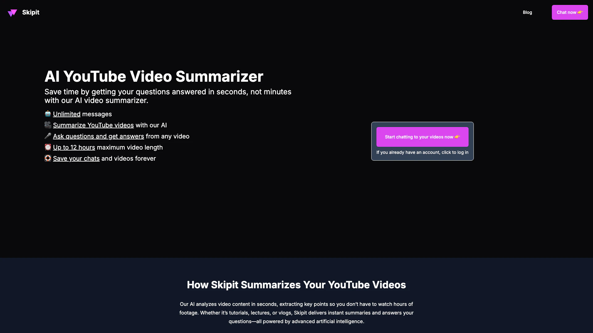 - Instant Video Summarization: Skipit provides instant summaries of YouTube videos, saving users hours of watching time.