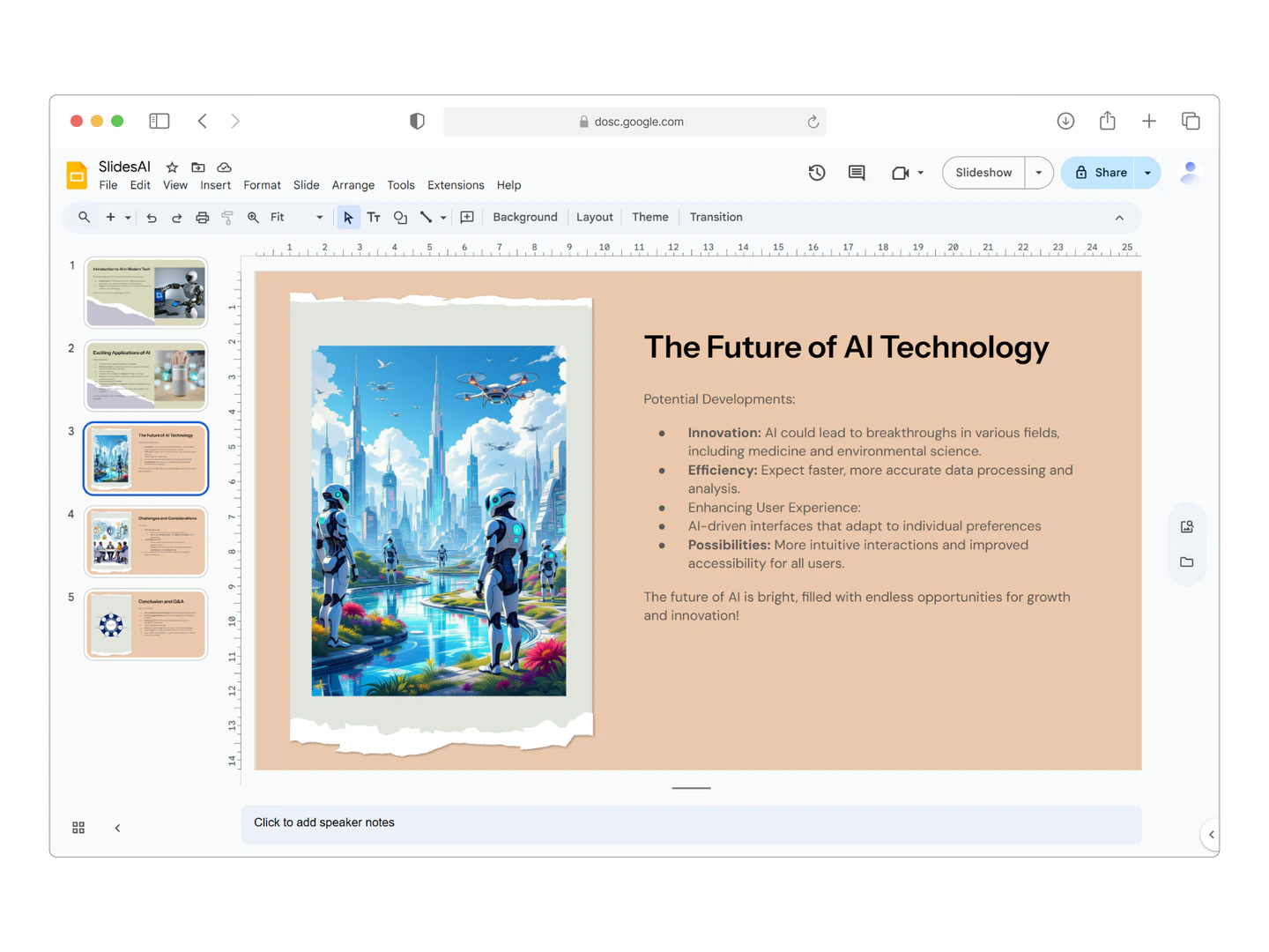- User-Friendly Interface: No design skills are required to use SlidesAI, making it accessible for everyone, including those who may not be tech-savvy.