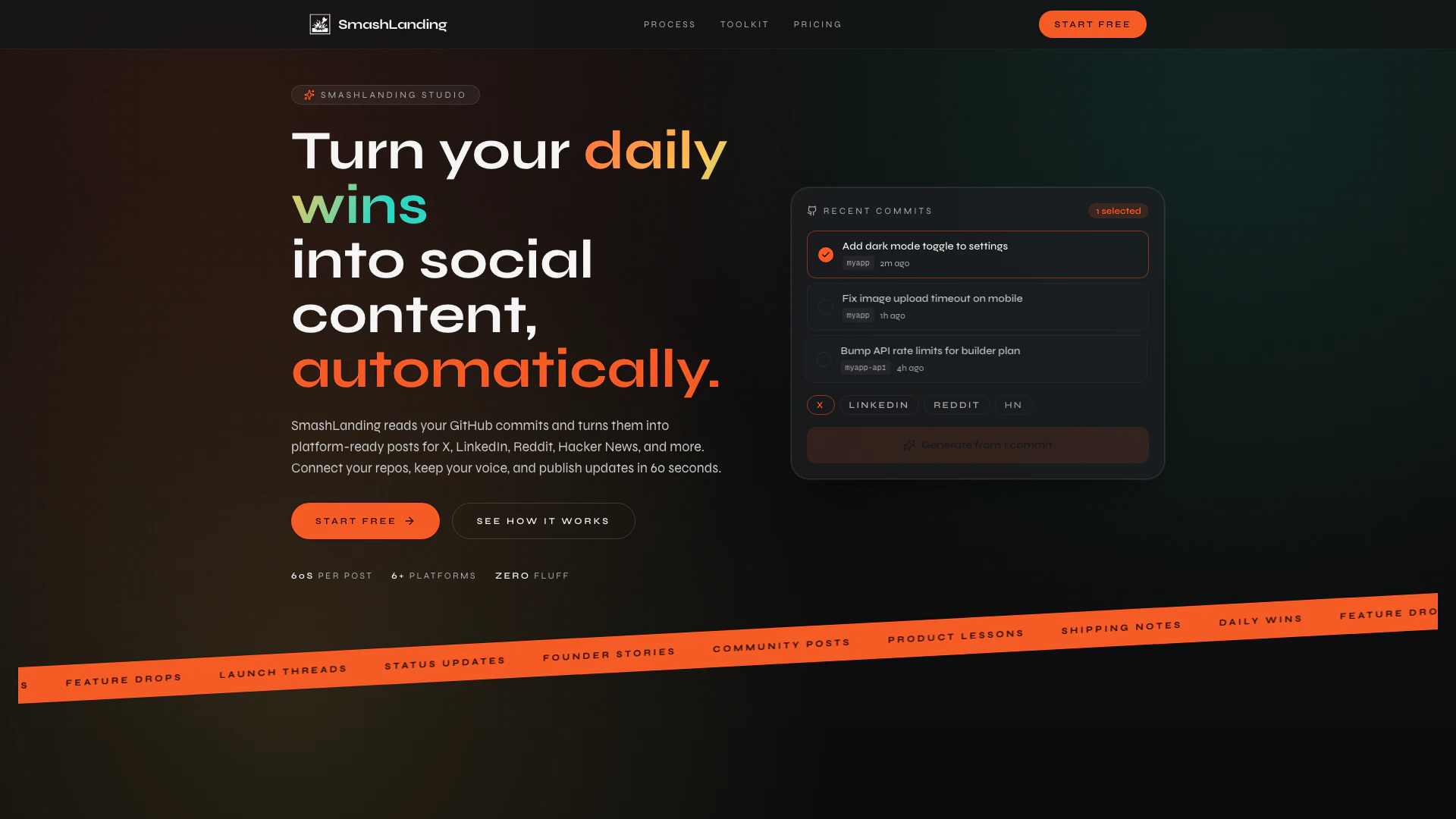 Smashlanding is an innovative AI tool designed to transform your daily wins into engaging, platform-specific social media content. By seamlessly integrating with your GitHub account, Smashlanding automatically generates posts tailored for various social media platforms, including Twitter, LinkedIn, Reddit, and Hacker News, in just 60 seconds. This tool allows users to maintain their authentic voice while effectively communicating their achievements and updates, thus enhancing visibility and engagement across multiple channels.