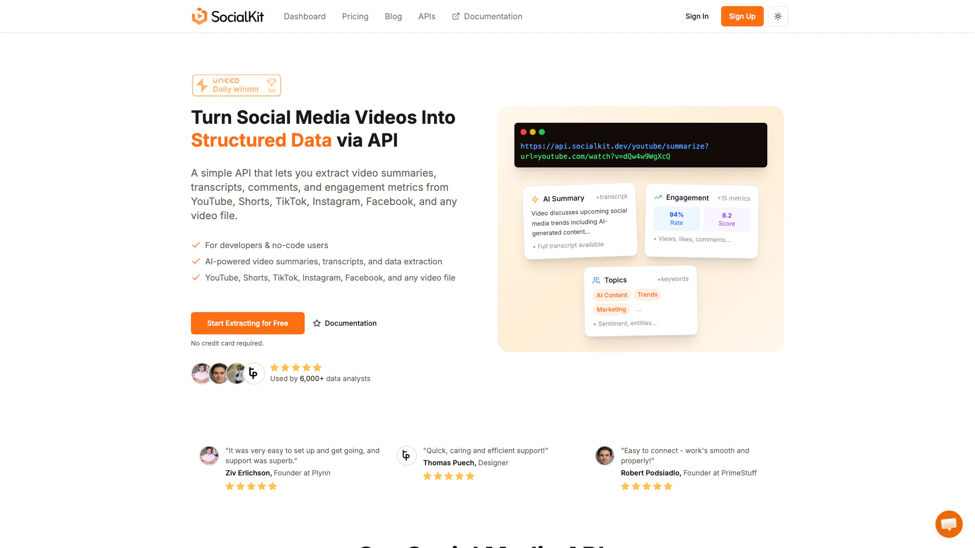 - Comprehensive Data Extraction: SocialKit allows users to extract structured data from various social media platforms, including video summaries, transcripts, and engagement metrics.