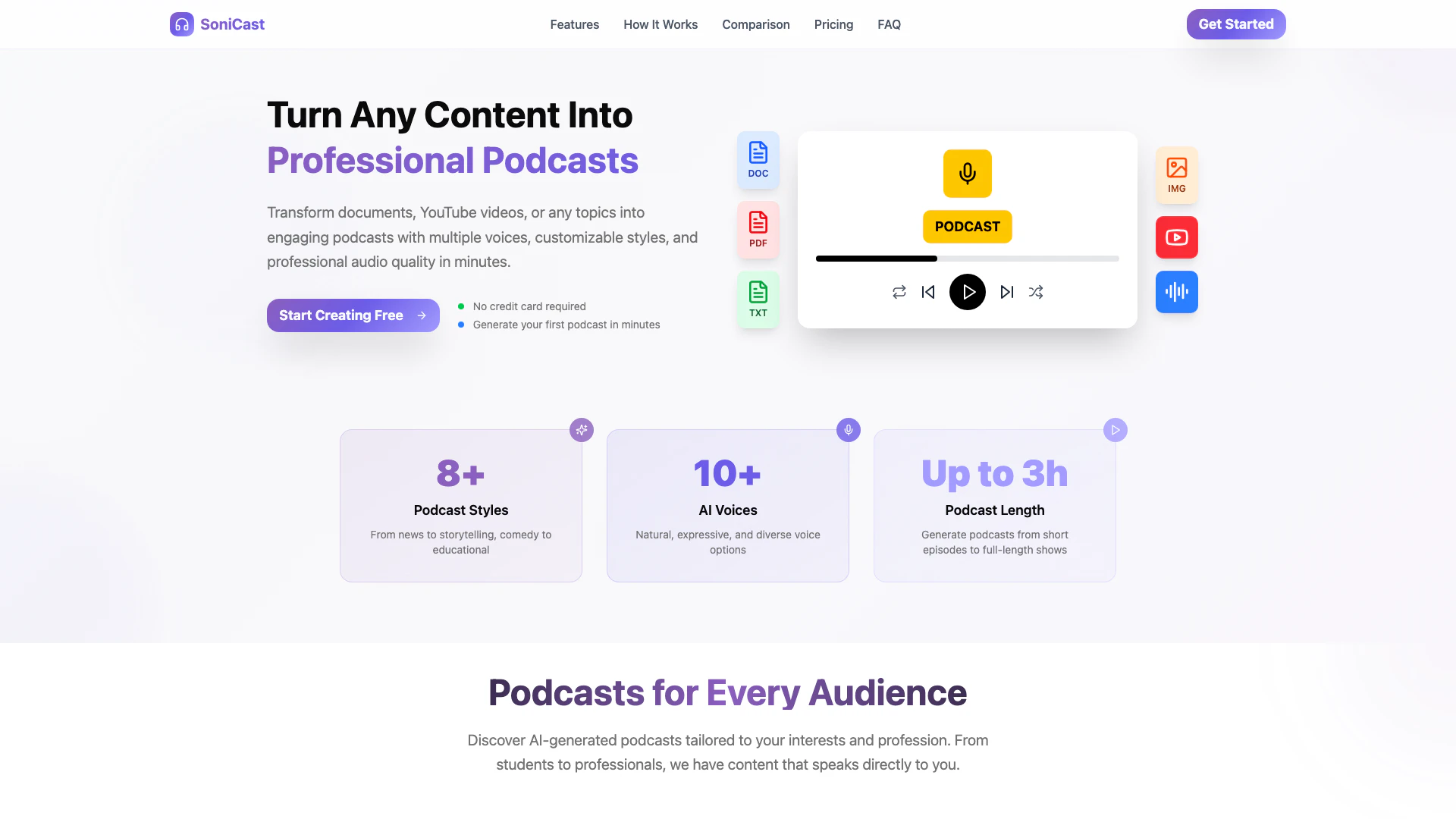 - Content Transformation: Convert documents, videos, and various topics into podcasts quickly.