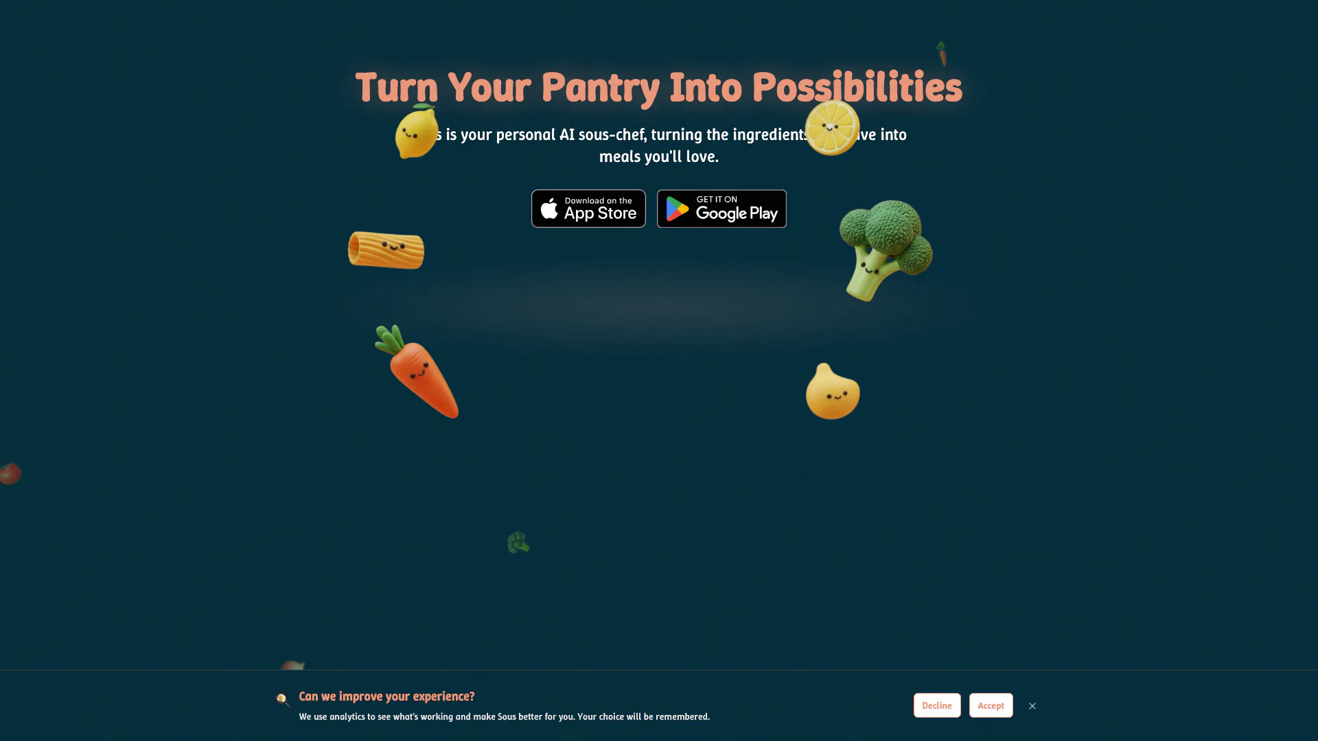 Sous is your personal AI sous-chef that generates recipes from the ingredients you already have. It tracks your pantry, suggests meals based on your inventory, and provides step-by-step cooking guidance.