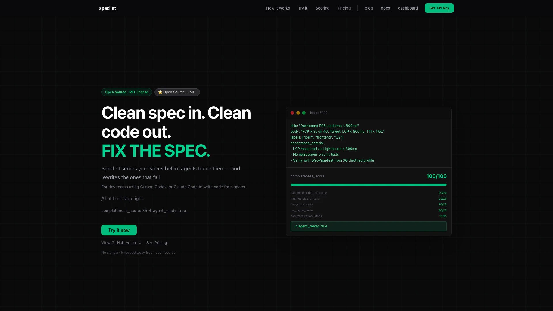 Speclintai is an innovative tool designed to enhance the quality of specifications before they are processed by AI coding agents. By scoring every GitHub issue based on its completeness and clarity, Speclint ensures that only well-defined specifications lead to successful code outputs. This proactive approach helps prevent the shipping of broken code, making it easier for development teams to deliver high-quality software efficiently. Speclintai offers a free tier for users to try its capabilities without any commitment.