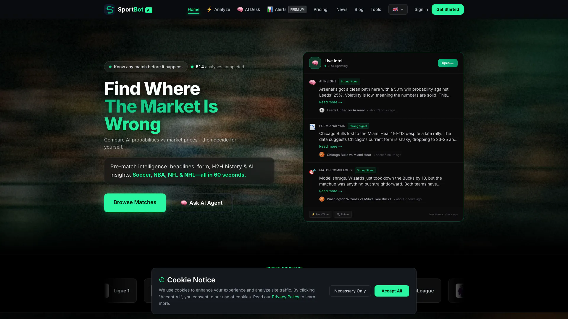 SportBot AI is an AI-powered sports analytics platform that helps you find where the market is wrong. We provide real-time analysis including team form, injuries, key stats, and probability estimates — so you can spot edges and make smarter decisions.