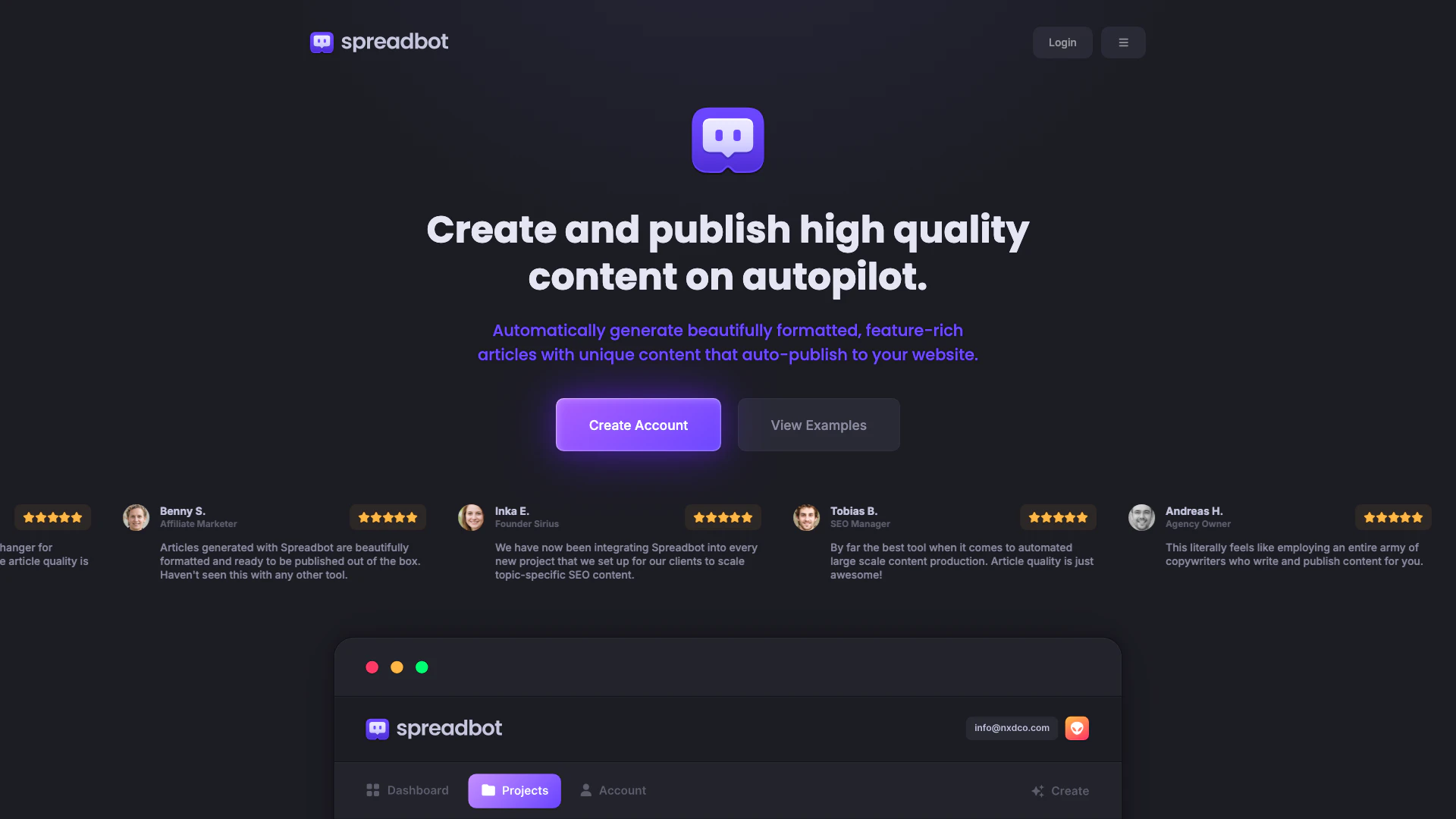Spreadbot is a tool that automates content creation, generating high quality, feature-rich articles that publish to your website. It is designed to scale SEO and increase blog engagement with zero manual effort.
