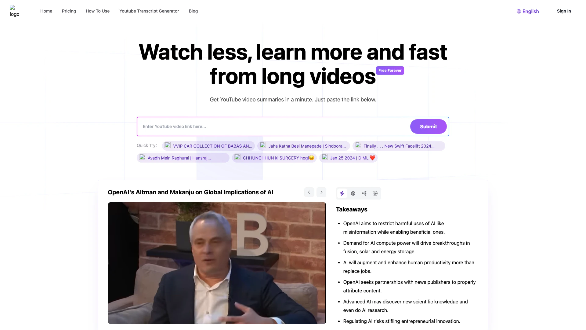 - Get Your Summary: Within a minute, receive a detailed summary that includes key insights, highlights, and segmented information, allowing you to quickly understand the video's content.