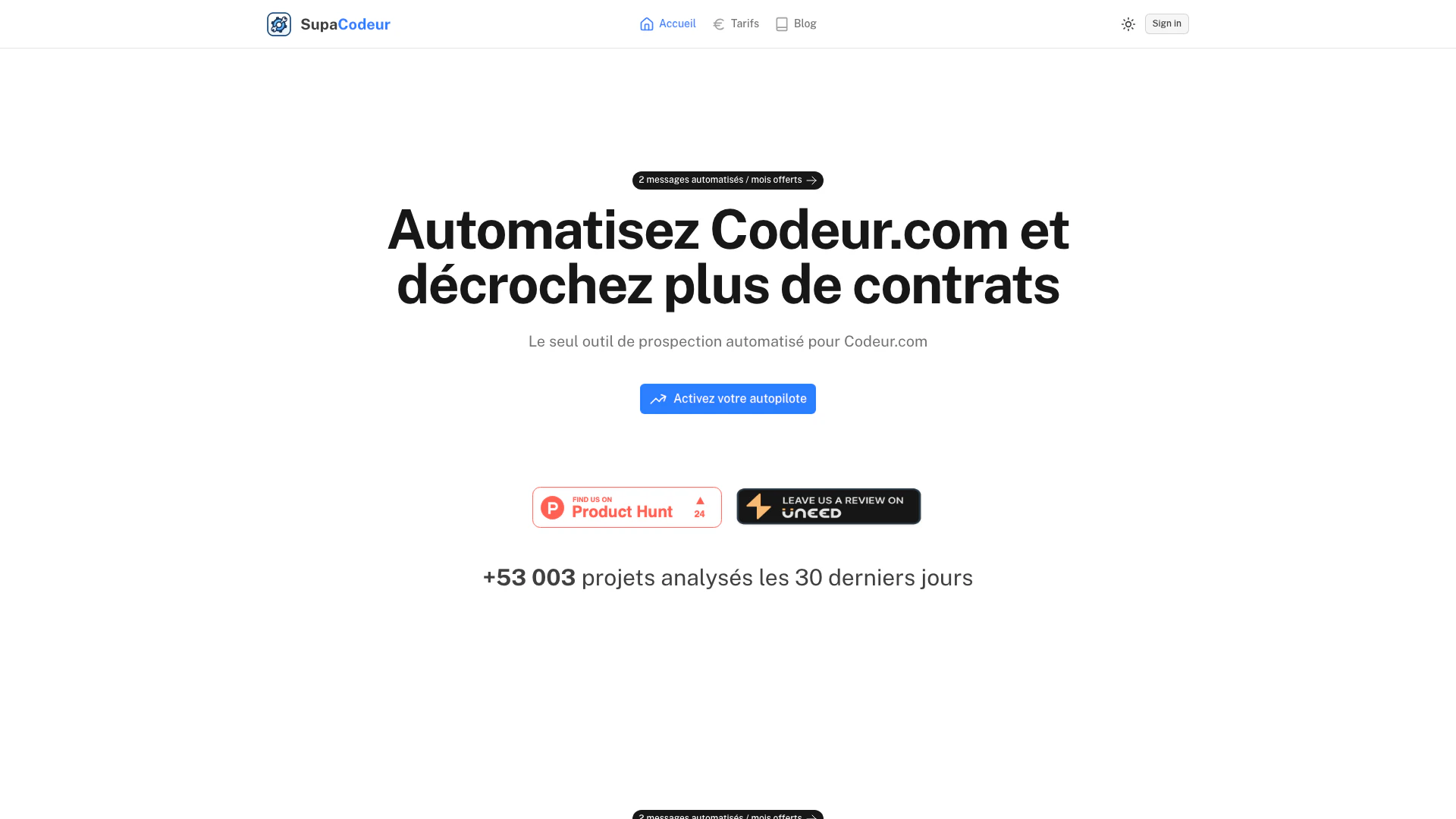 - Automated Prospecting: SupaCodeur automates your prospecting on Codeur.com, allowing you to contact 10 times more prospects efficiently.