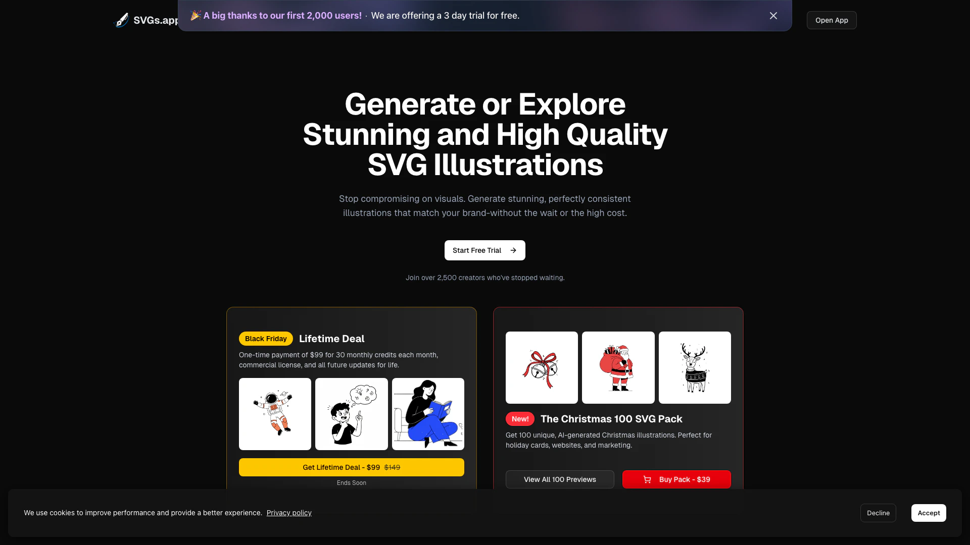 SVGs.app is designed for individuals, small projects, professionals, and large organizations looking to create stunning SVG illustrations quickly and affordably.