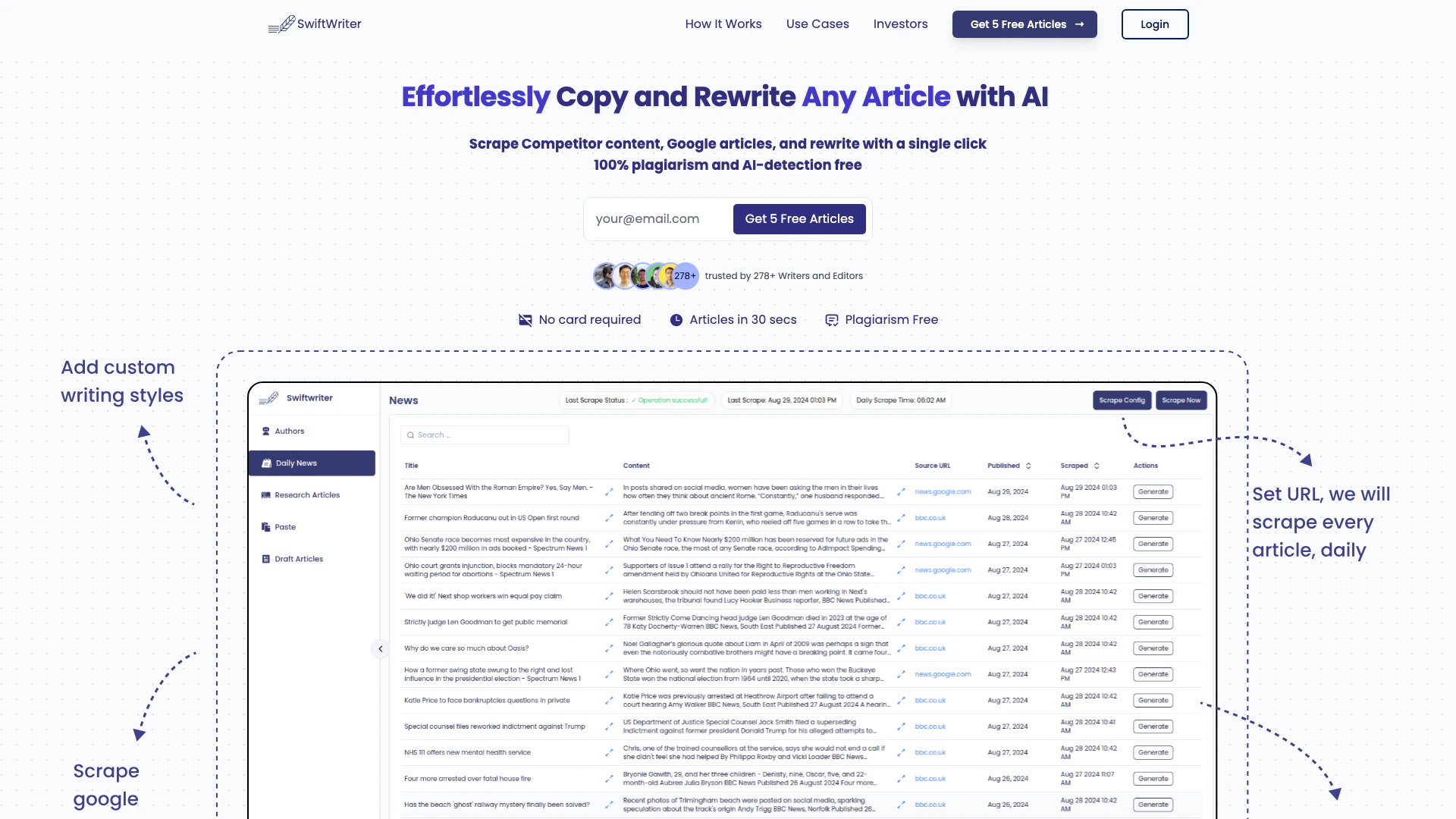 To use Swiftwriterai, follow these steps: 1. Sign Up: Create an account on the Swiftwriterai website to get started. 2. Input Competitor Websites or Keywords: Enter the URLs of competitor sites or relevant keywords to scrape articles related to your topic. 3. Add Context: Customize your article by selecting the desired writing style, length, and additional context to enhance the content. 4. Rewrite Content: Use the AI feature to rewrite the scraped articles, ensuring originality and quality. 5. Edit and Finalize: Review the drafted article in the editor, adding images or any final touches before publishing.