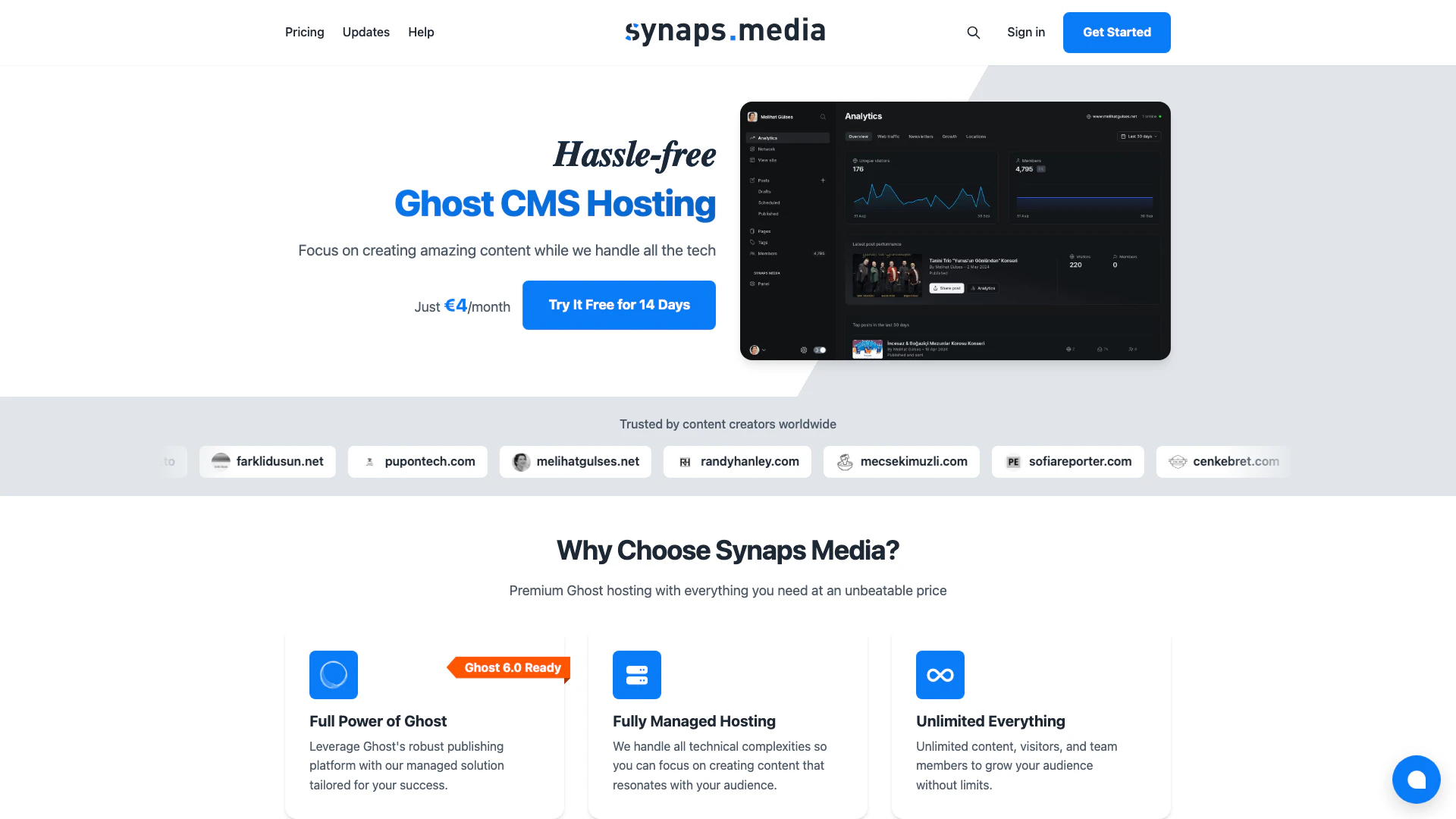 - Fully Managed Hosting: Synapsmedia offers fully managed hosting for Ghost CMS, handling all technical complexities so users can focus on content creation.