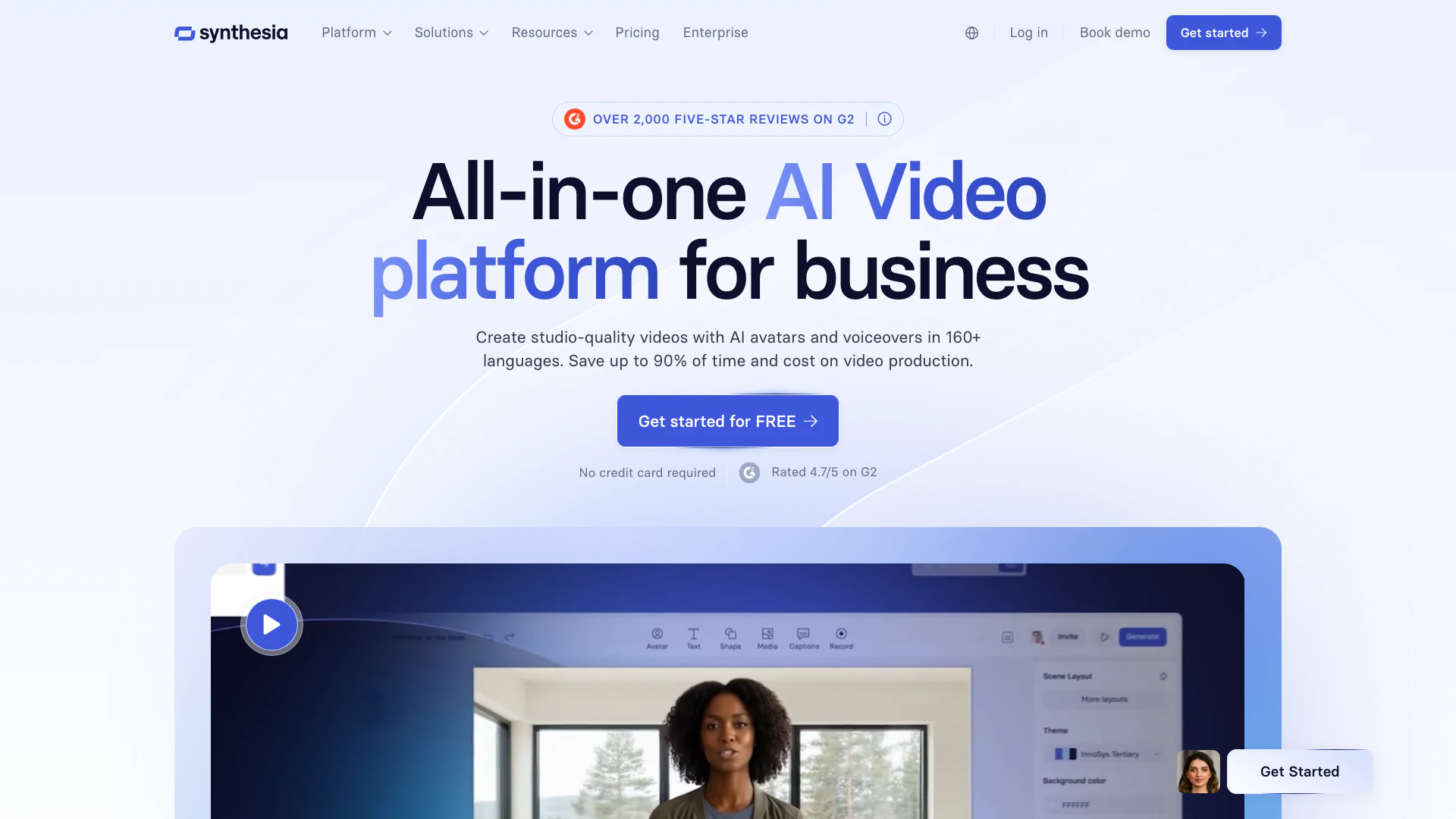 Produce AI videos regularly with your team. Billed monthly or annually. Includes 1 editor & 5 guests, 180+ Synthesia AI Avatars, AI Dubbing, API access, and more. Includes 3,600 credits/mo, usable for up to 30 minutes of video/month.