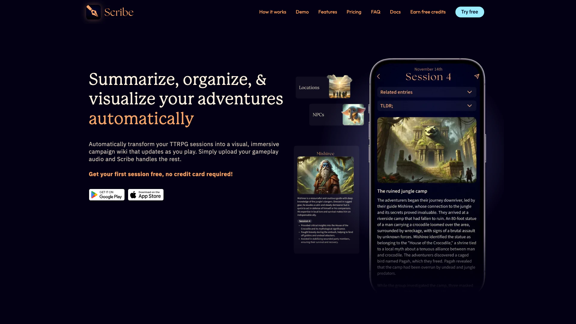 Scribe is an AI-powered assistant for tabletop roleplaying games (TTRPGs) that transforms your game sessions into a living campaign record. After you upload an audio recording of your session, Scribe transcribes the dialogue, summarizes the events, and creates a session recap. It also identifies key NPCs, locations, and story elements, automatically organizing them into a connected campaign wiki. As your game progresses, Scribe updates entries and keeps everything in sync—so your players stay immersed and your world stays consistent.