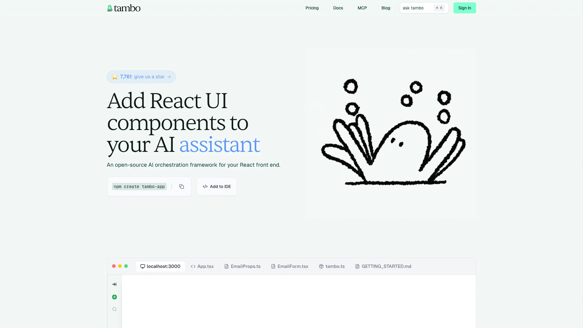 Tambo is an open-source[1] AI orchestration[2] framework designed specifically for integrating intelligent features into React applications[3]. It allows developers to easily add AI-driven components, enabling the creation of hyper-personalized user interfaces. Tambo's core value lies in its ability to streamline the development process by providing a comprehensive set of tools and features that facilitate the integration of AI functionalities directly into the front end of applications.
