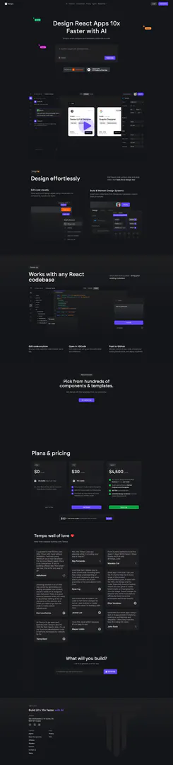 Tempo is an AI-powered tool designed to help users prompt, develop, and design code effortlessly, facilitating collaboration between designers and developers for faster web development.