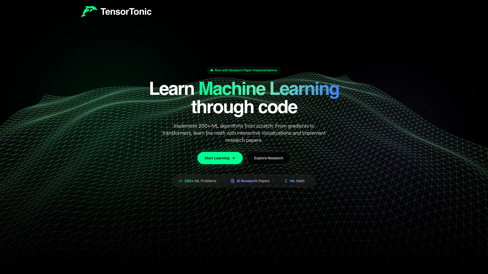 TensorTonic is a platform that allows users to learn machine learning by implementing over 200 algorithms and research papers from scratch. It provides interactive coding problems to help users understand various ML concepts.