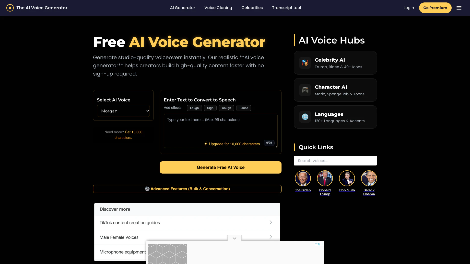 - User-Friendly Interface: The platform allows users to generate voiceovers instantly with no sign-up required, streamlining the content creation process.