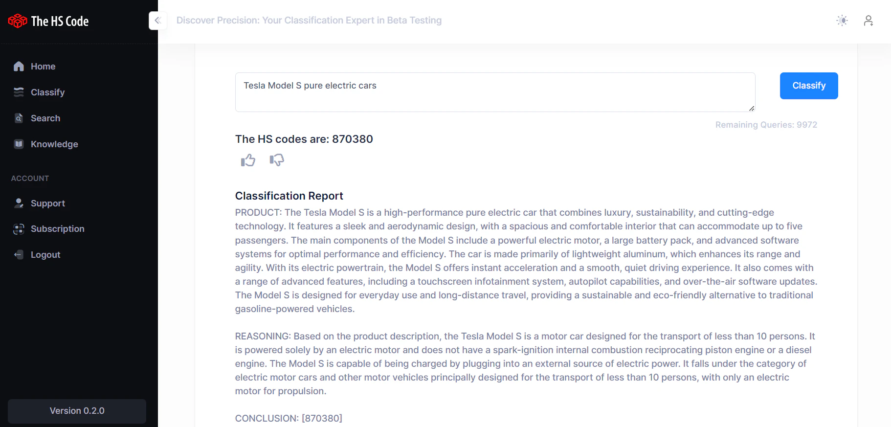 - Reliable Results[6]: Provides consistent and accurate HS code classifications backed by extensive data.